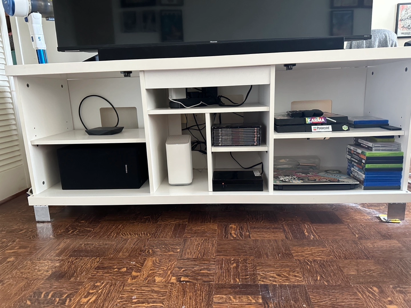 White TV unit, measures 59 1/2 inches width, 25 inches height, 16 inches depth.