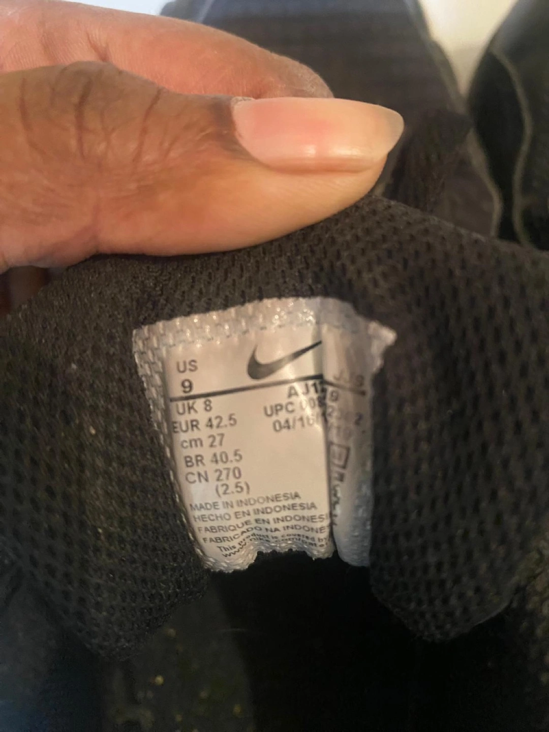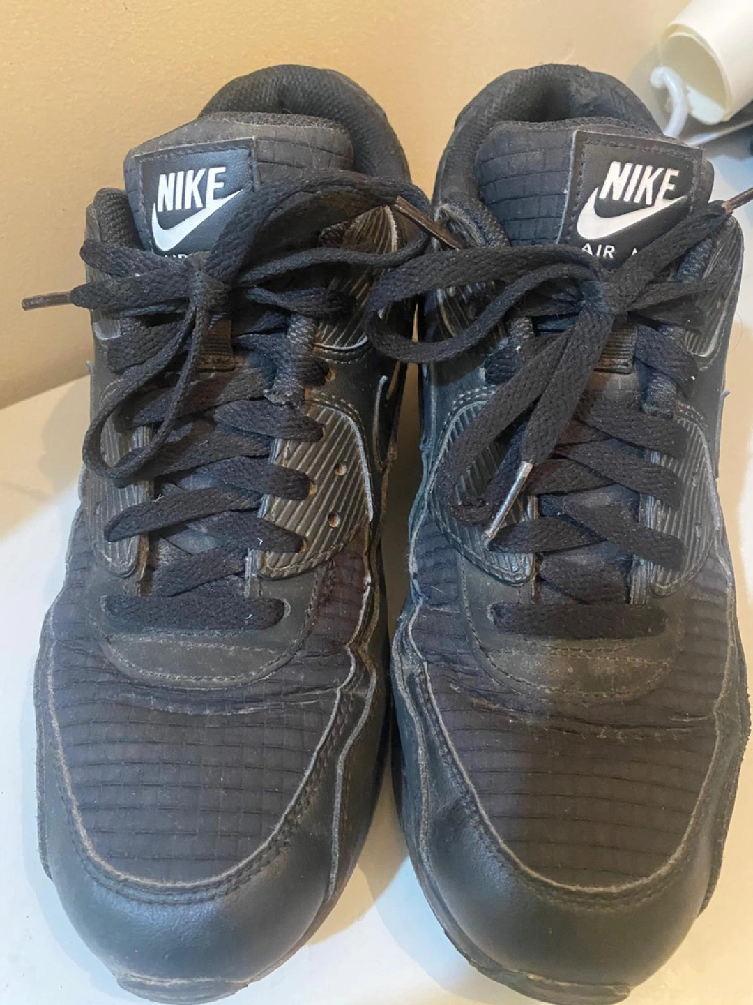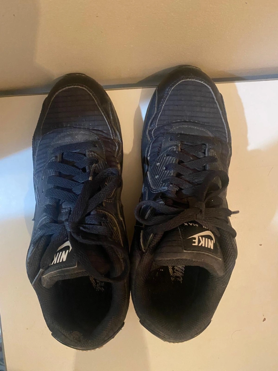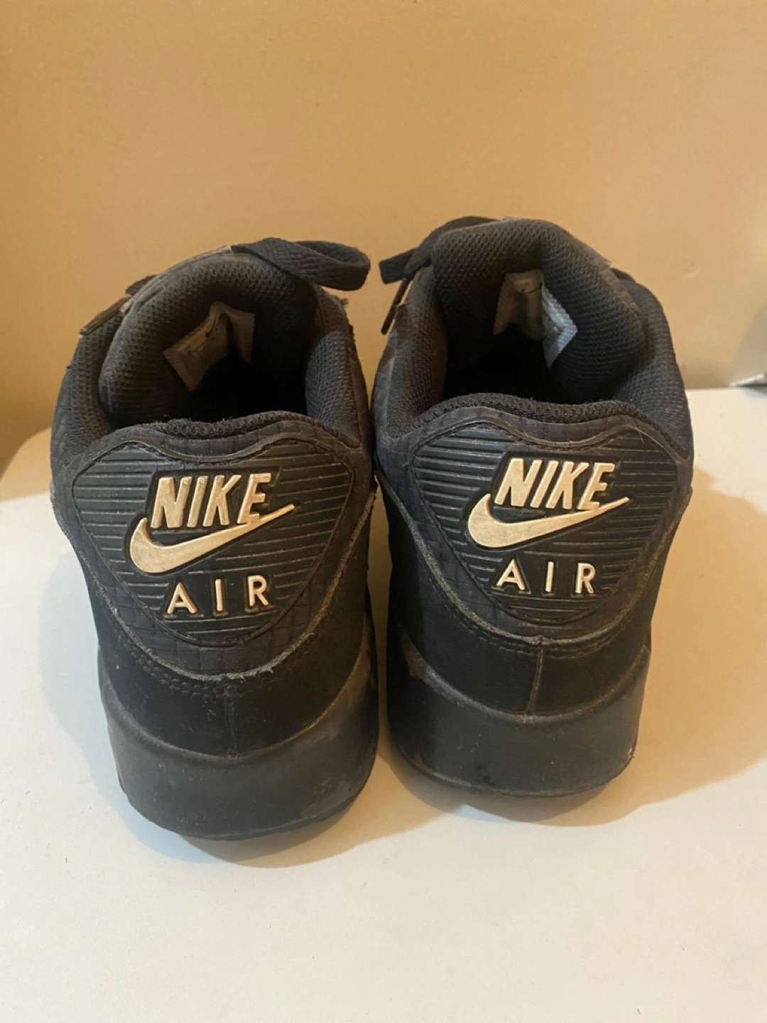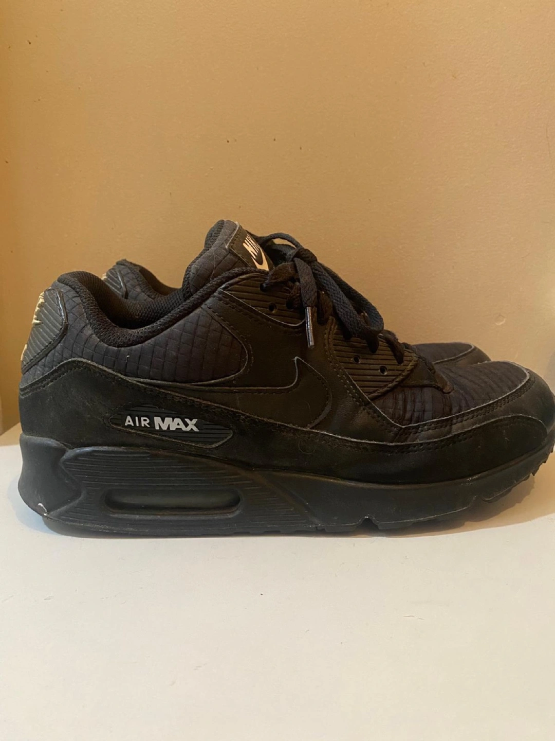 Pre-owned Nike Air Max 90 sneakers. Black colourway. Size US 9, UK 8, EUR 42.5. Made in Indonesia. Good for everyday wear.