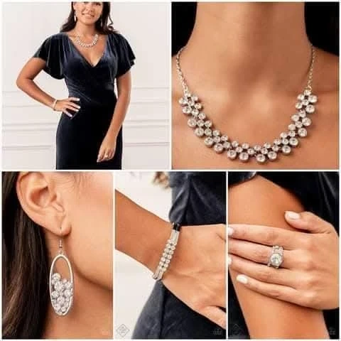Selling a beautiful Paparazzi jewelry set! This set includes a necklace, a pair of earrings, a bracelet, and a ring, all featuring a sparkling design. Perfect for adding a touch of glamour to any outfit!