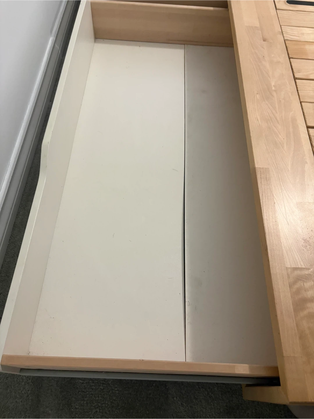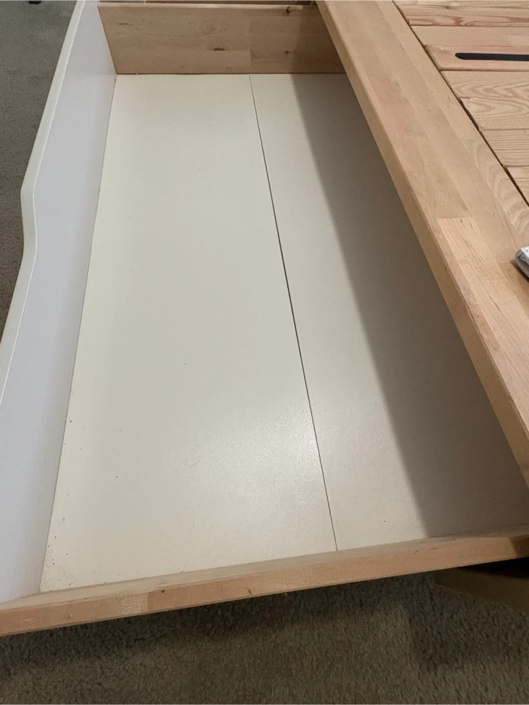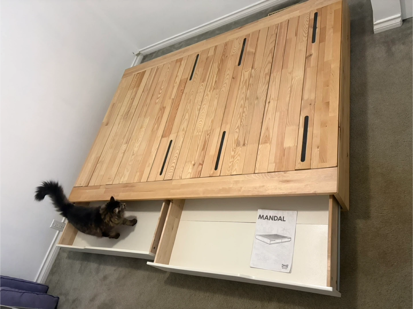 This is the IKEA MANDAL double size bed frame with built-in storage drawers. It's made of solid wood and particleboard with a birch veneer finish. The drawers provide ample space for linens or clothing. Assembly instructions are included. Some boards in the drawers are a little warped from heavy stuff being stored, but still fully functional!
