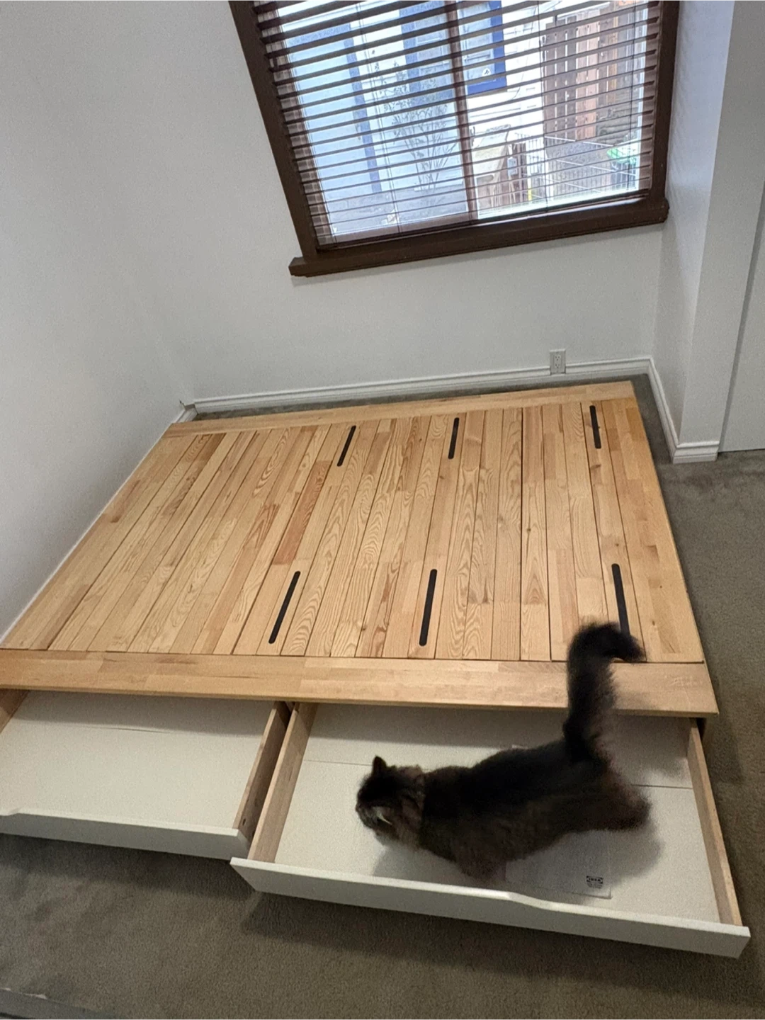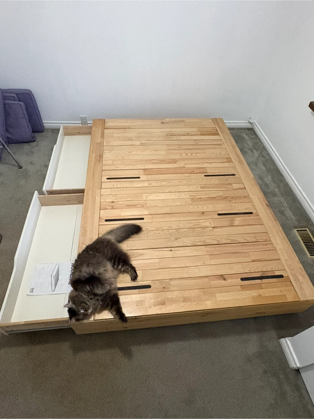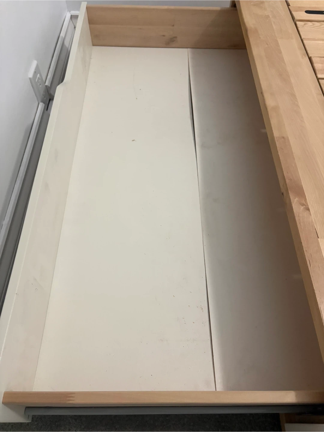 This is the IKEA MANDAL double size bed frame with built-in storage drawers. It's made of solid wood and particleboard with a birch veneer finish. The drawers provide ample space for linens or clothing. Assembly instructions are included. Some boards in the drawers are a little warped from heavy stuff being stored, but still fully functional!