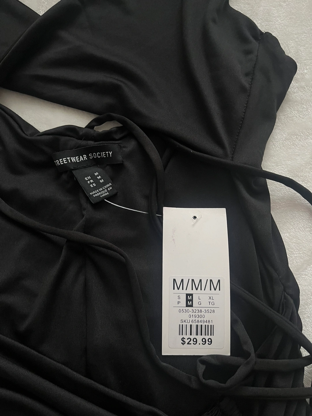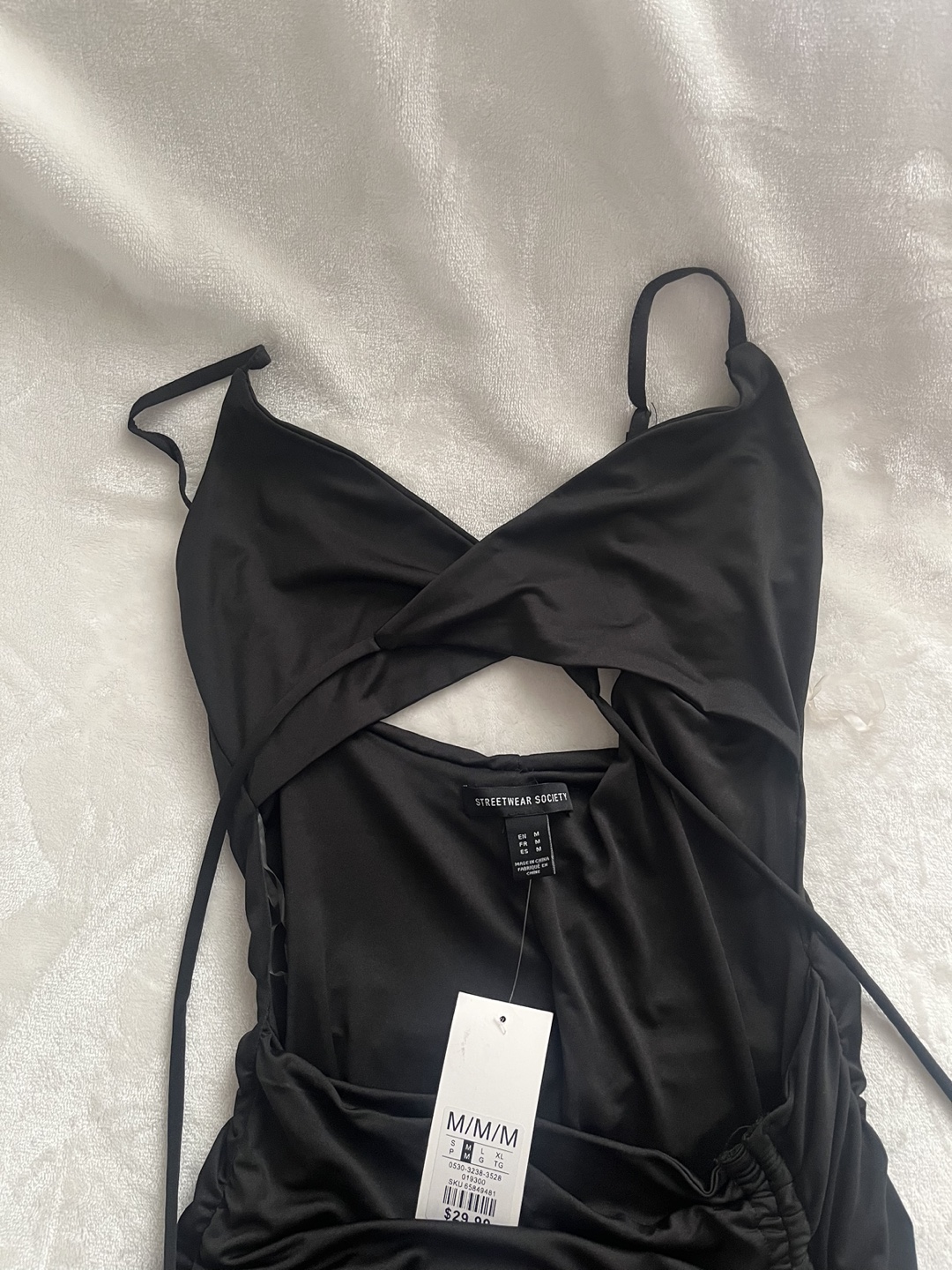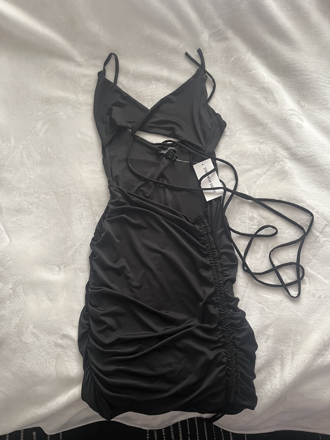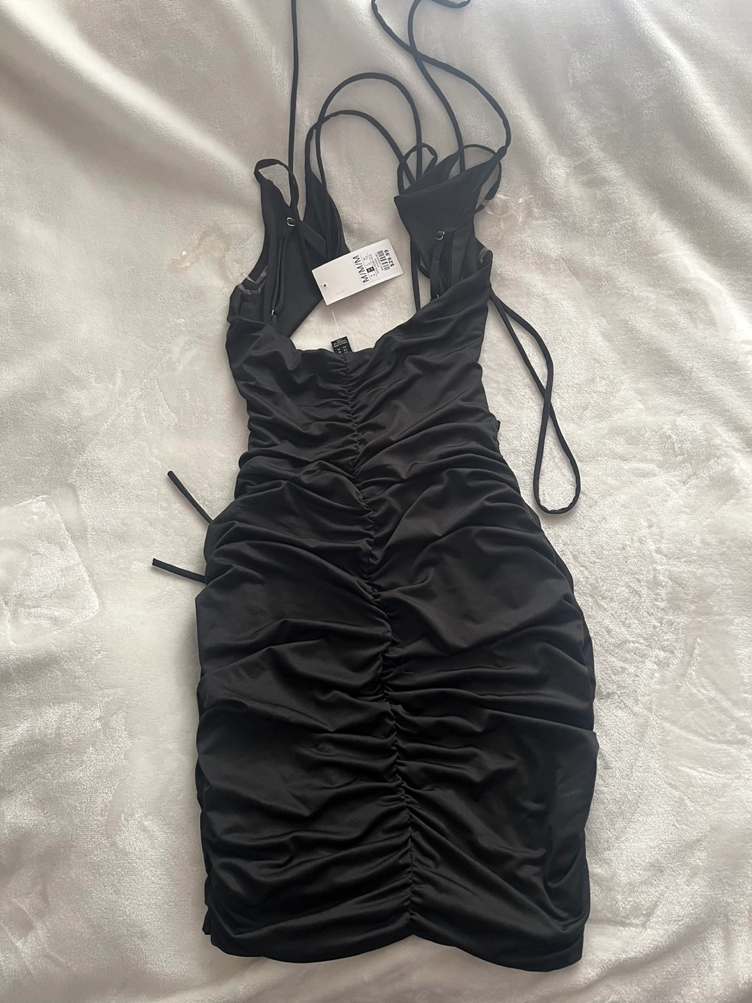 I bought this as a back up birthday dress but didn’t end up ever wearing it, very stretchy material and super flattering ruching on the backside, the top ties together on the front and has an open stomach area. Super cute for the club!!
