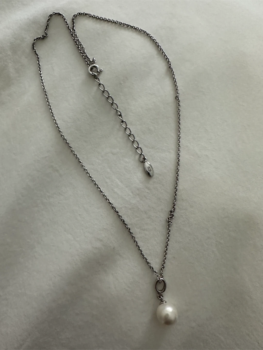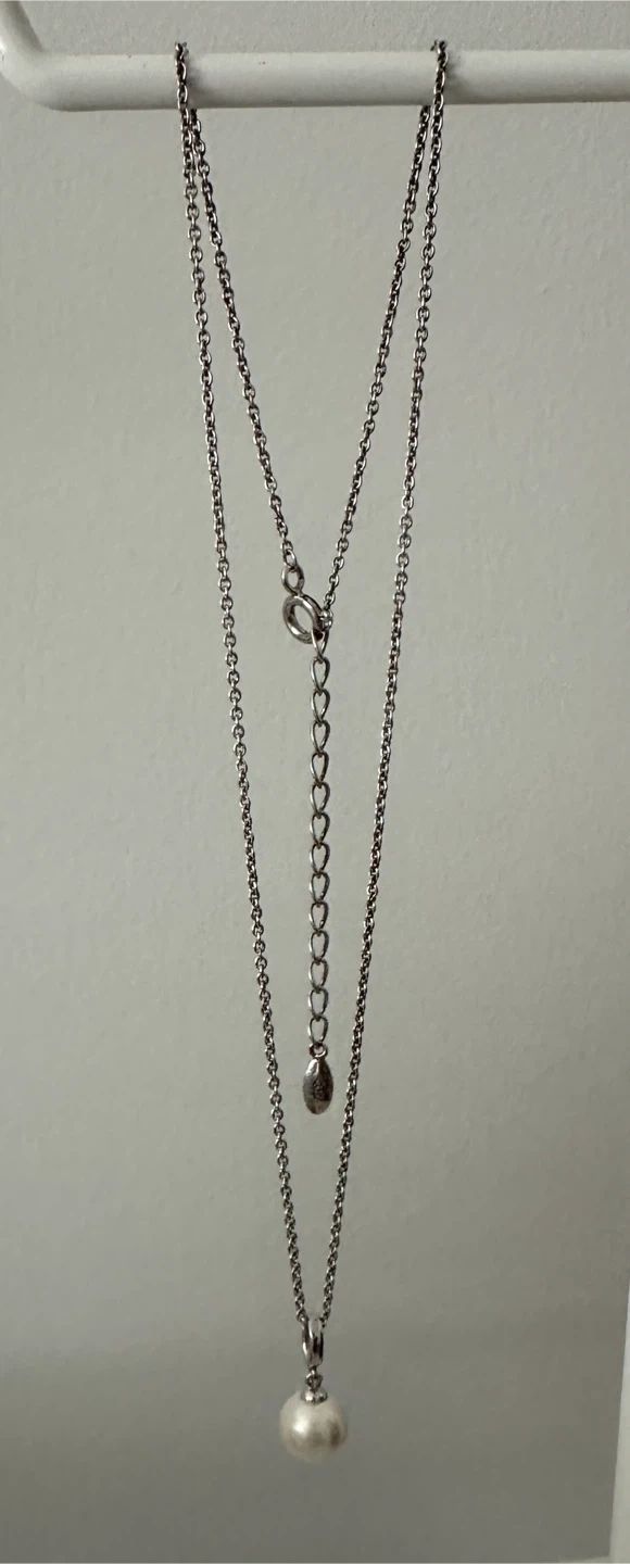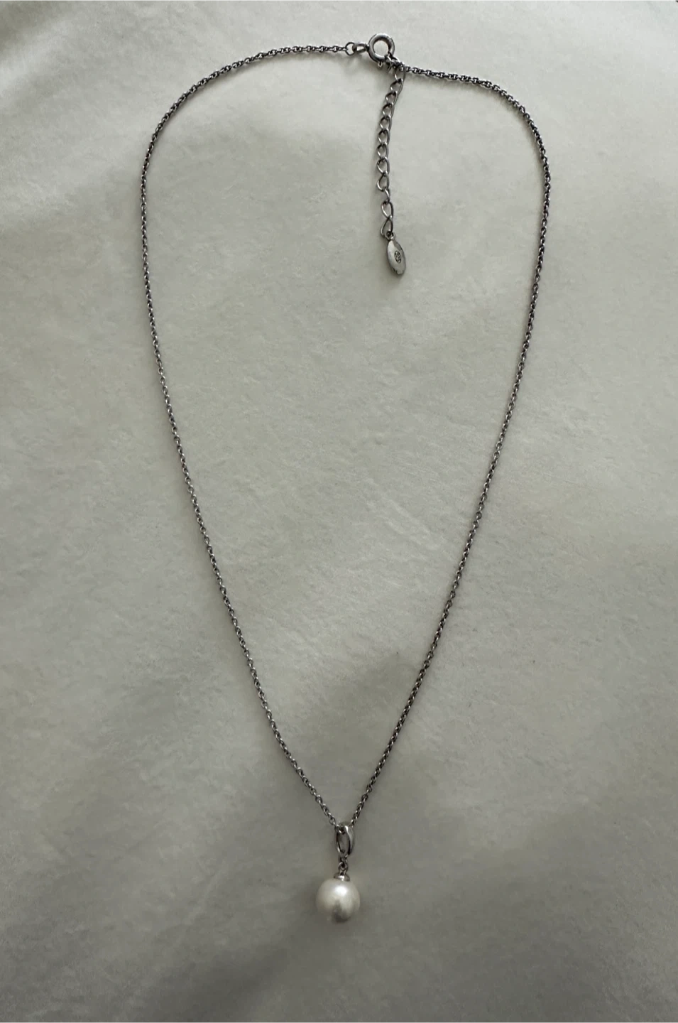 Selling a delicate silver necklace featuring a beautiful pearl pendant. It's in great condition and would make a lovely addition to any jewelry collection. Pearl has a little scratch. Length is 15-17“.