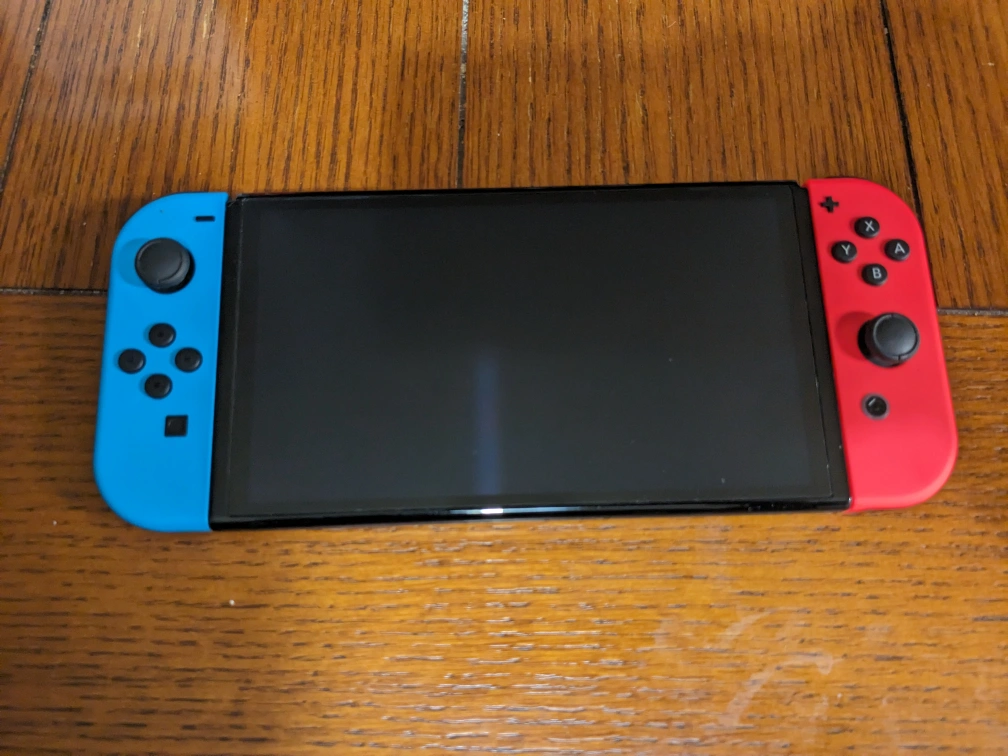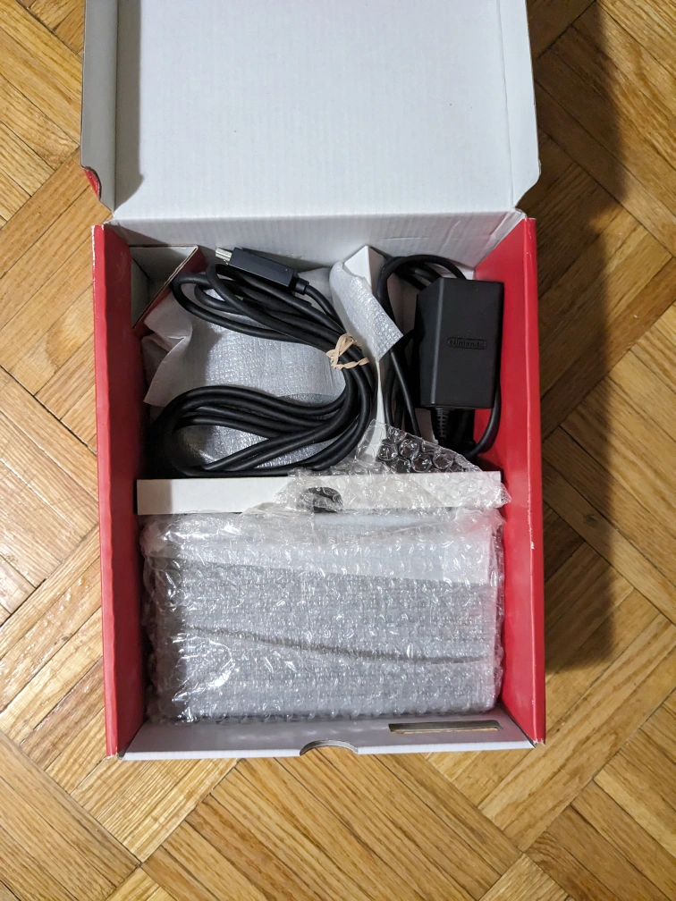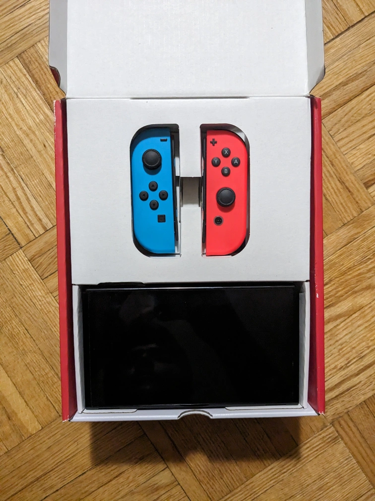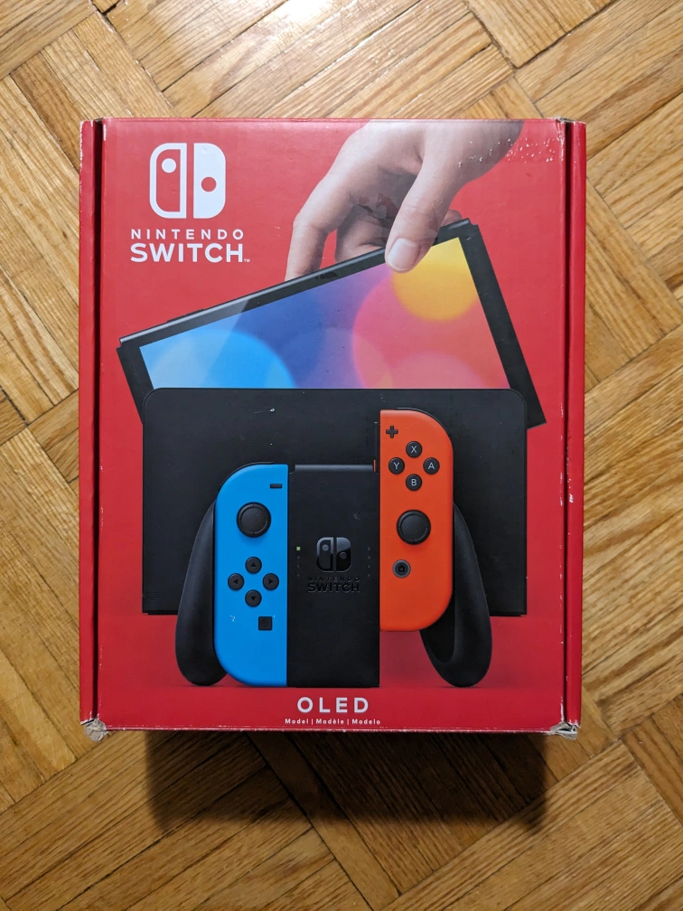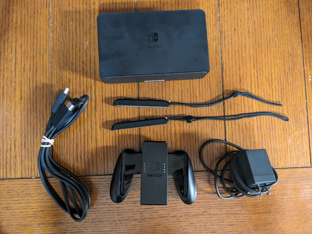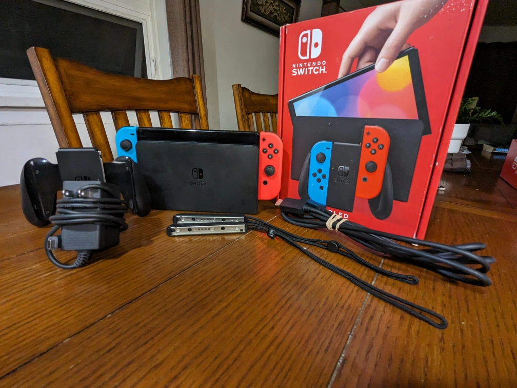 What's included: Nintendo switch OLED, Neon Blue & Red Joycons, Docking station, Wrist straps, Joycon grip, AC Adapter, HDMI cable, 32 GB SD card, and the original Nintendo Switch OLED box.