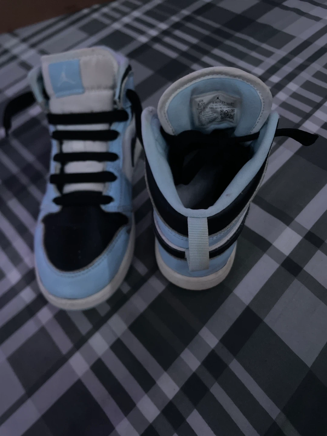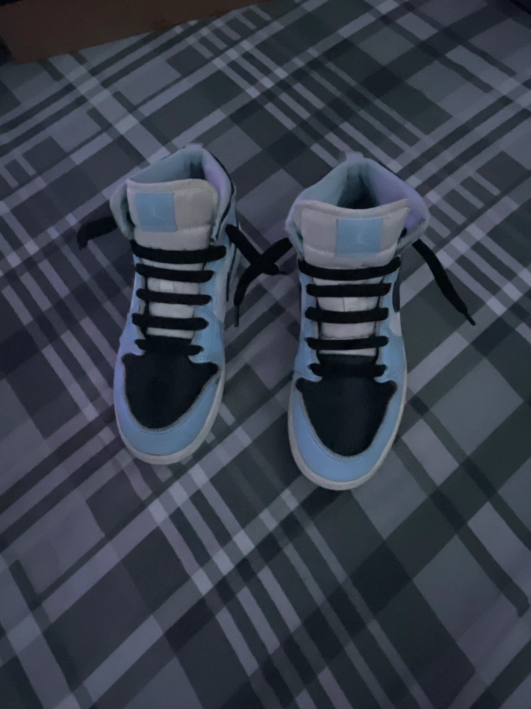 These are Air Jordan 1 High OG sneakers in the "University Blue" colorway. They feature a leather construction with textile accents. This is a pair of high-top athletic shoes.
