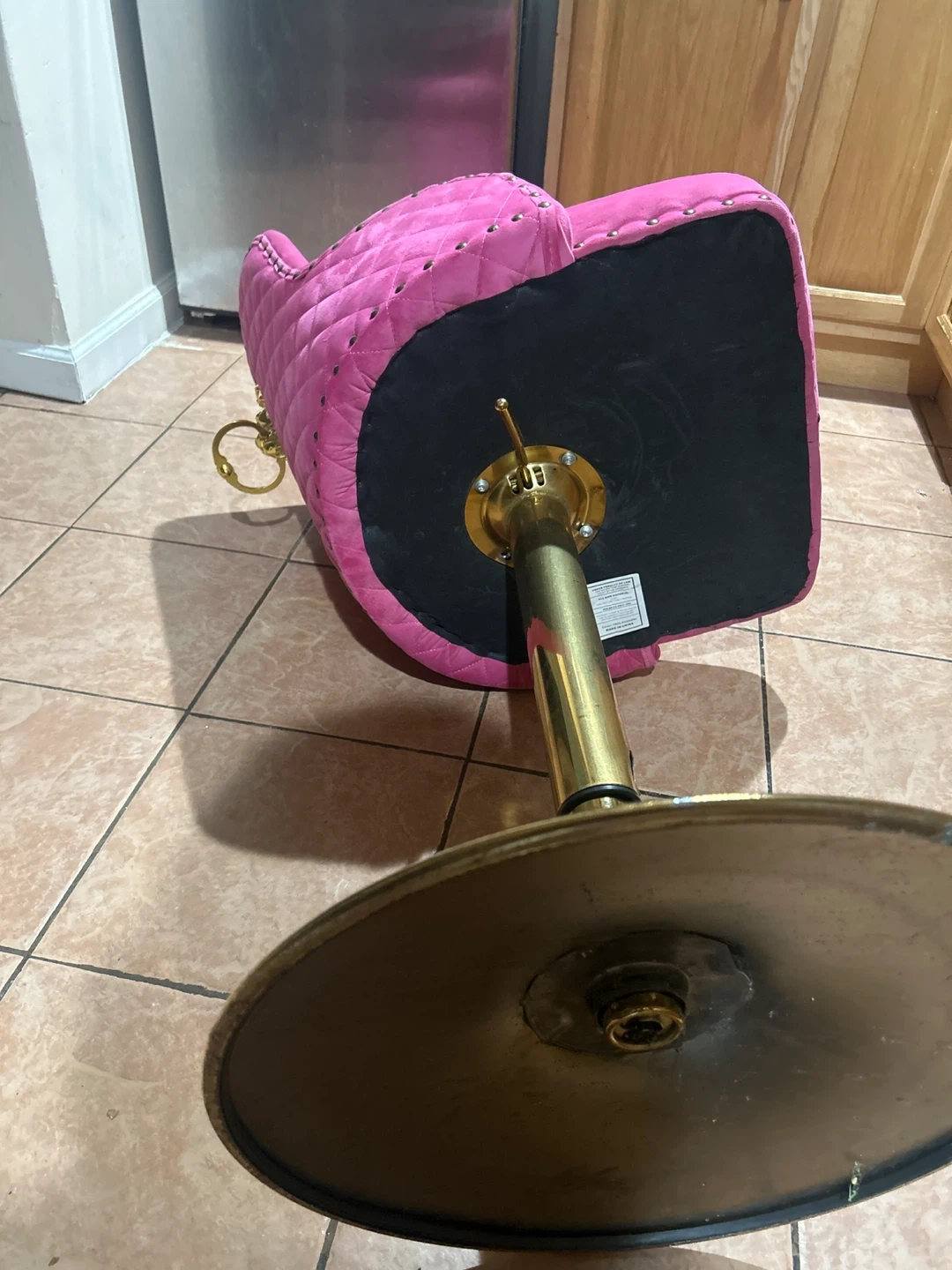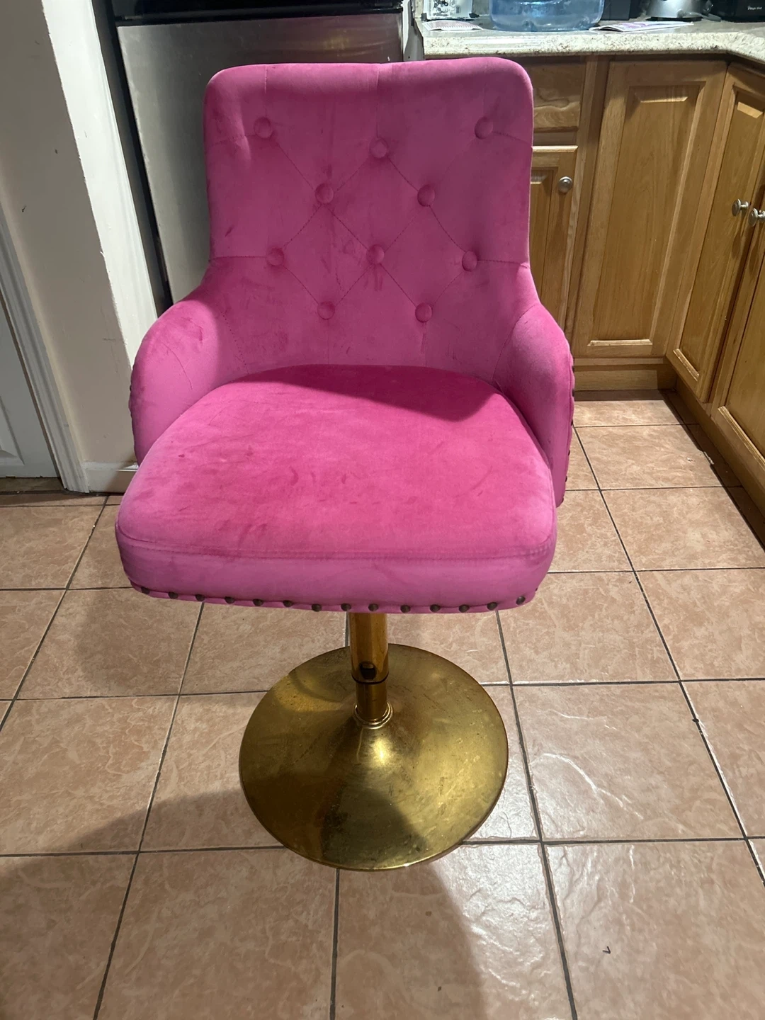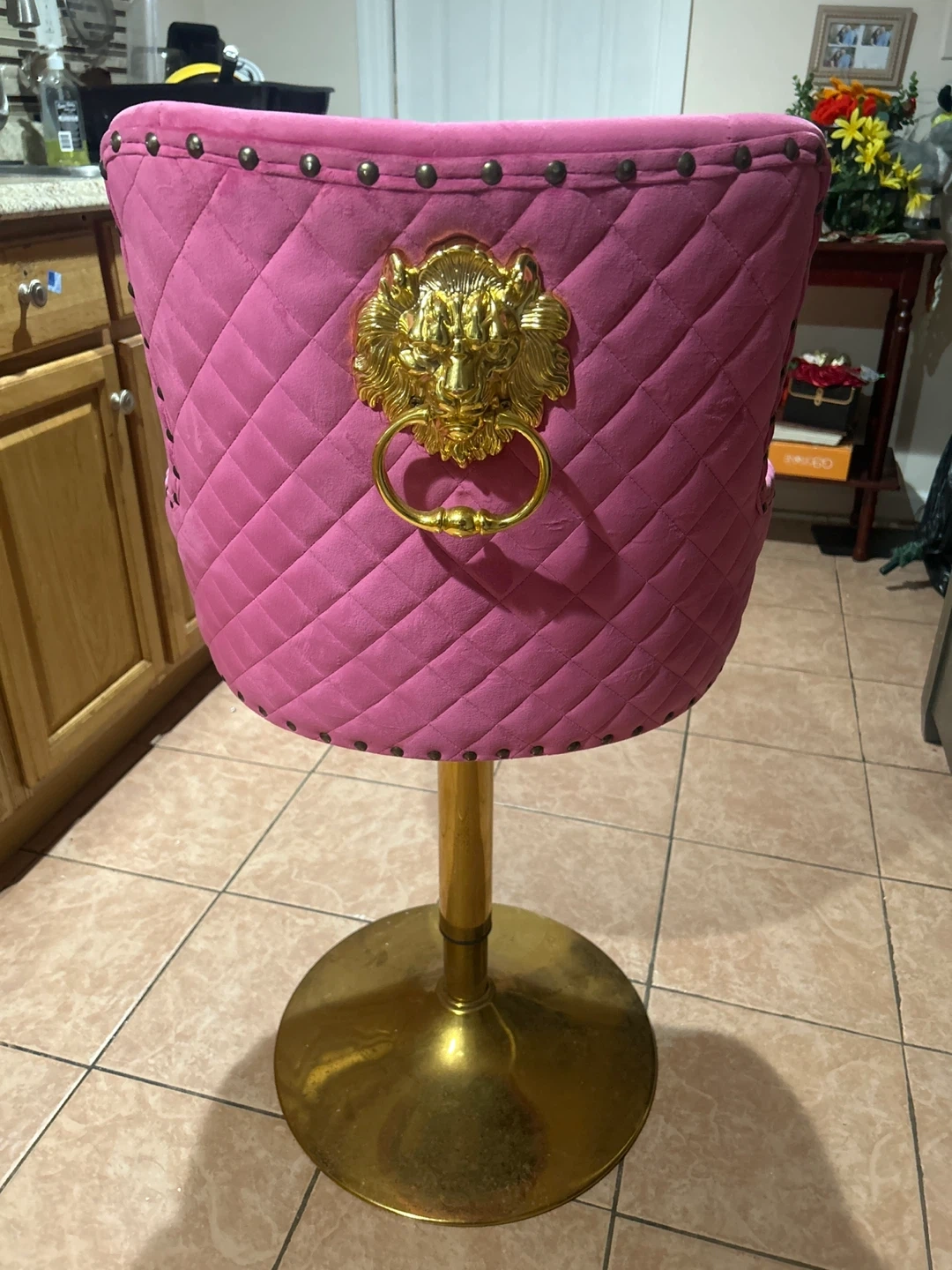 Selling a stylish pink velvet bar stool! It features a comfortable seat, a quilted back with a decorative gold lion head, and a sturdy gold base. Perfect for adding a pop of color and elegance to your kitchen or bar area
