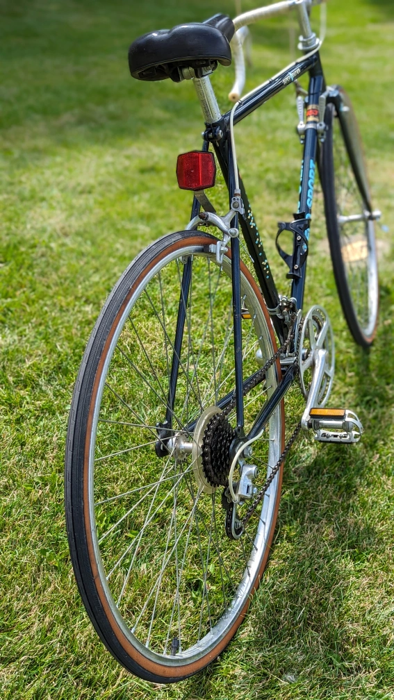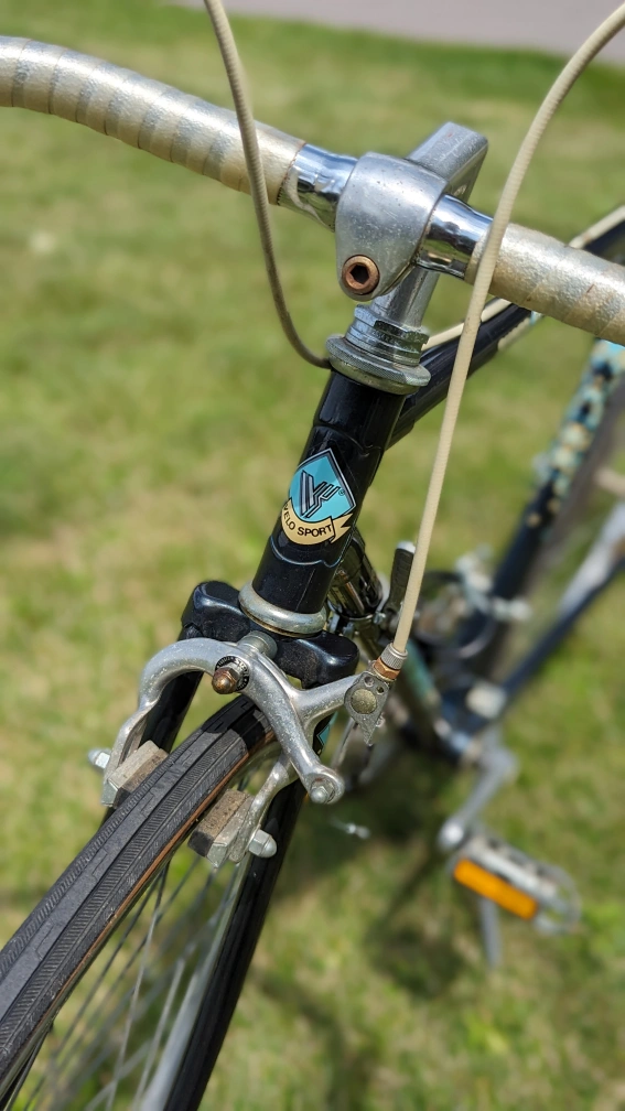Velo Sport (Stock - All Original) Super Routier - 12 Speed (Stock - All Original) Road Bike (Stored Indoors in a Smoke Free/Pest Free, Controlled Locker) Handle - Drop Bar Grip - Original Factory White Tape Frame Size : 22.5" Frame Material : Steel Tires : 27*1 1/4(both inflated) Quick Release : Front Wheel Rim Material : Steel Speed : 12 Speed (2*6 Speed) Gear Shifter : Shimano Downtube Shifters Front Derailleur : Shimano Rear Derailleur : Shimano Brake Levers : Metal Brakes : Caliper Crank Set : Sugino Stock Crank Set Pedals - Metal Pedals with Integrated Reflectors Seat : Original Factory Seat Colour : Blue Stickers : Original Velo Sport Bottle Cage : Upgraded New Black Bottle Cage Side Stand : Original Side Stand