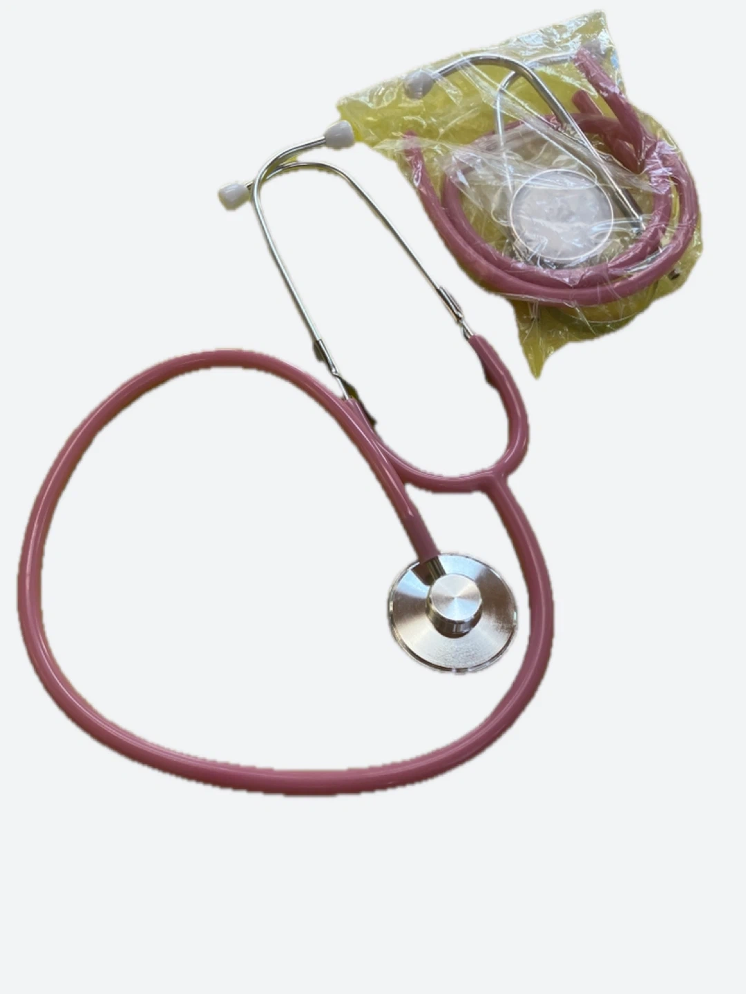 This is a pink stethoscope. It's in its original packaging. This would be useful for medical students or healthcare professionals.