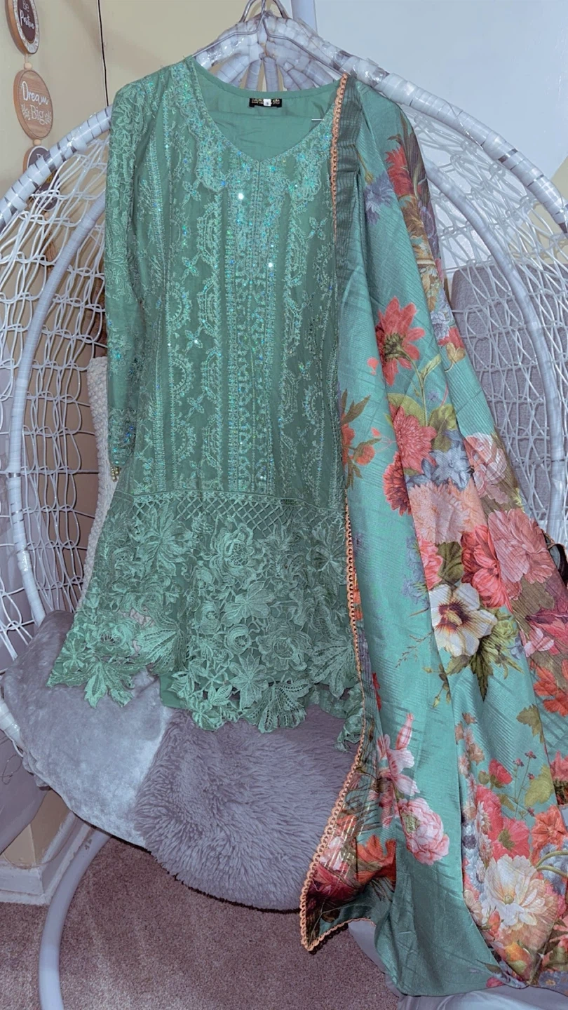Beautiful mint green lawn dress set with intricate floral embroidery. Includes a matching scarf with a vibrant floral print. Perfect for summer occasions or festive events!