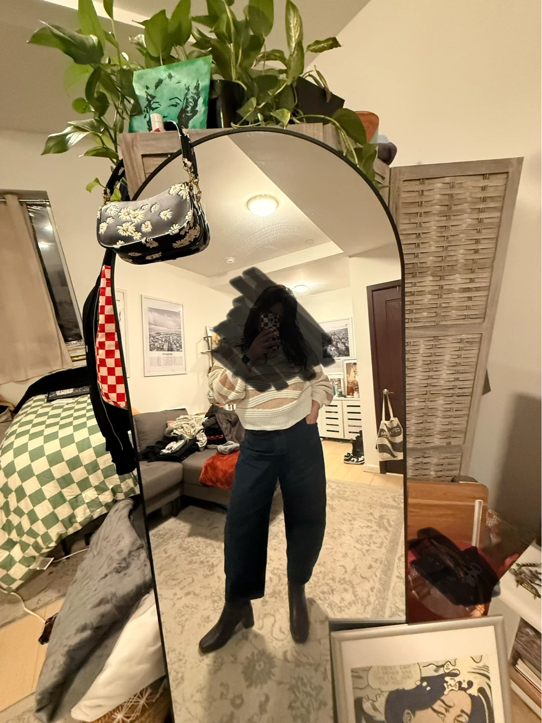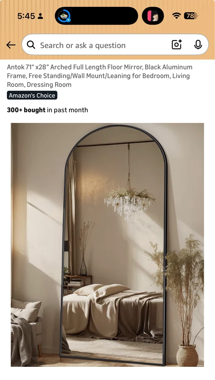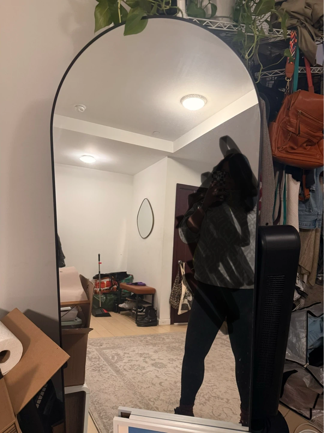 This is 71" x 28" arched full-length floor mirror. It features a black aluminum frame and can be used free-standing, wall-mounted, or leaning. It's perfect for a bedroom, living room, or dressing room!