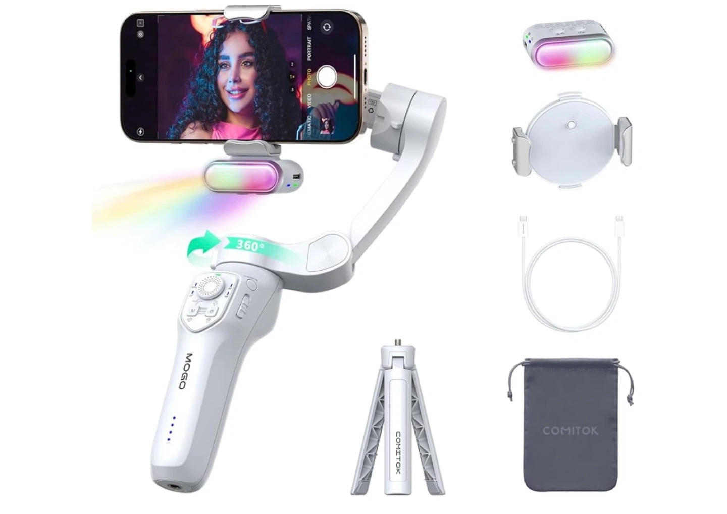 This MOGO smartphone gimbal stabilizer helps capture smooth videos. It's white and includes a phone mount, RGB fill light, charging cable, mini tripod, and a carrying pouch. It offers 360-degree rotation for versatile shots. Perfect for content creators and mobile videographers!