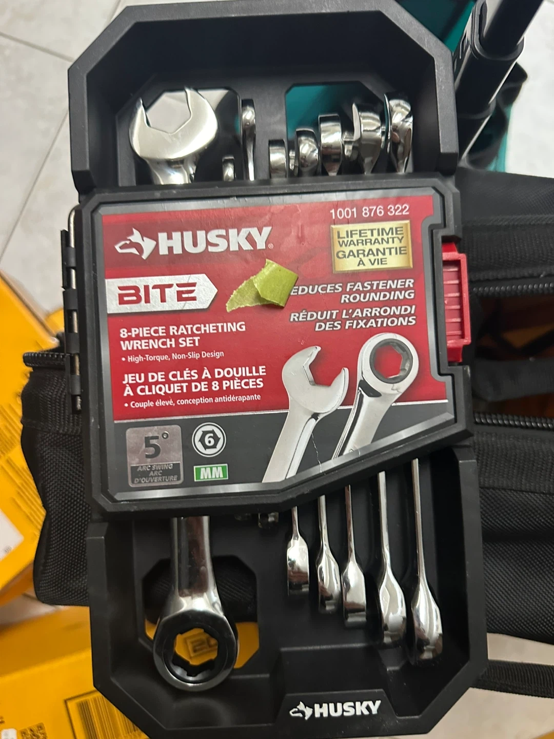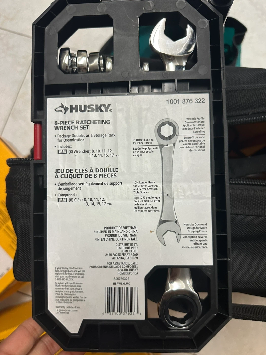 This Husky 8-piece ratcheting wrench set includes 8 wrenches in sizes 8, 10, 11, 12, 13, 14, 15, and 17 mm. It features a high-torque, non-slip design. The package doubles as a storage rack.