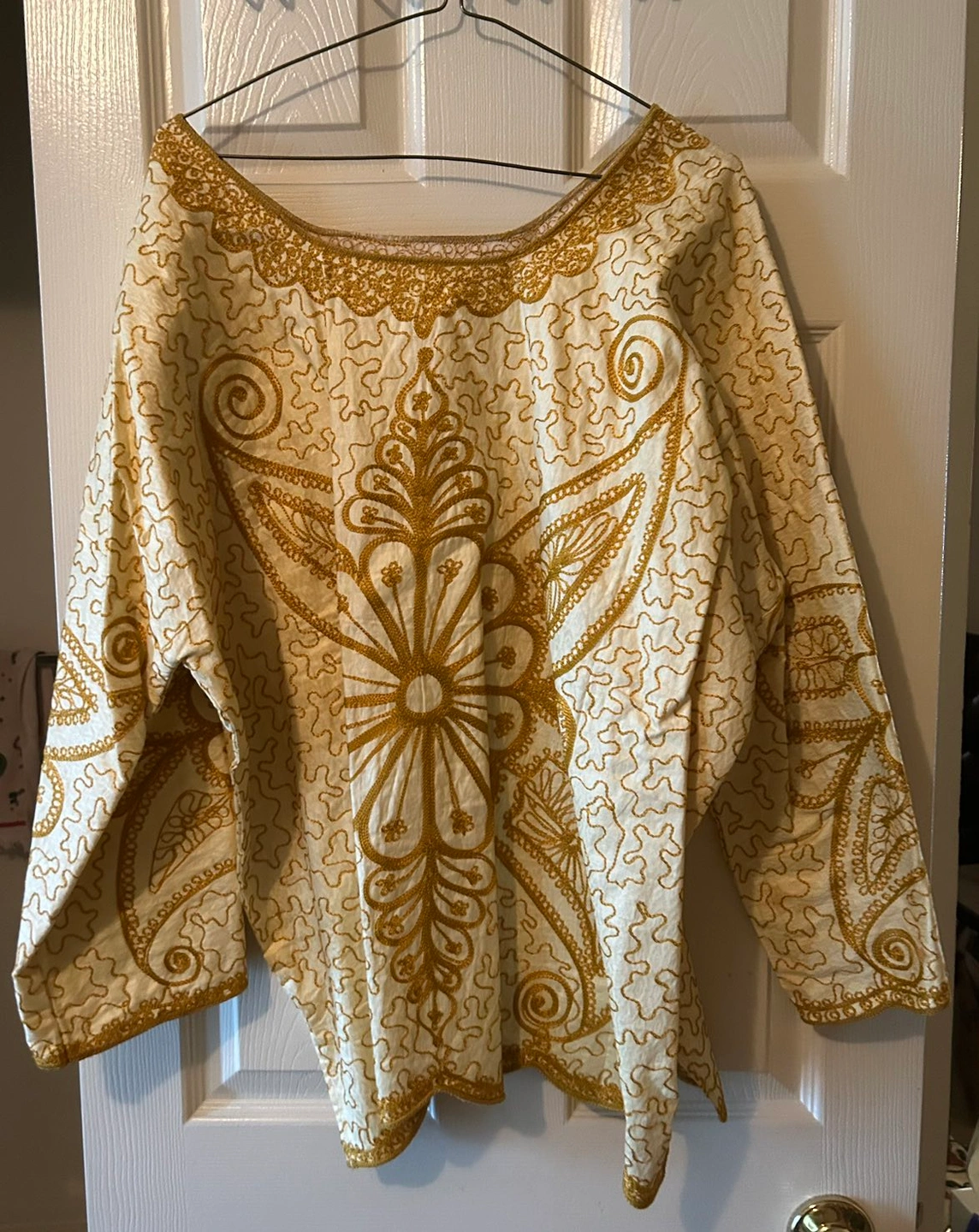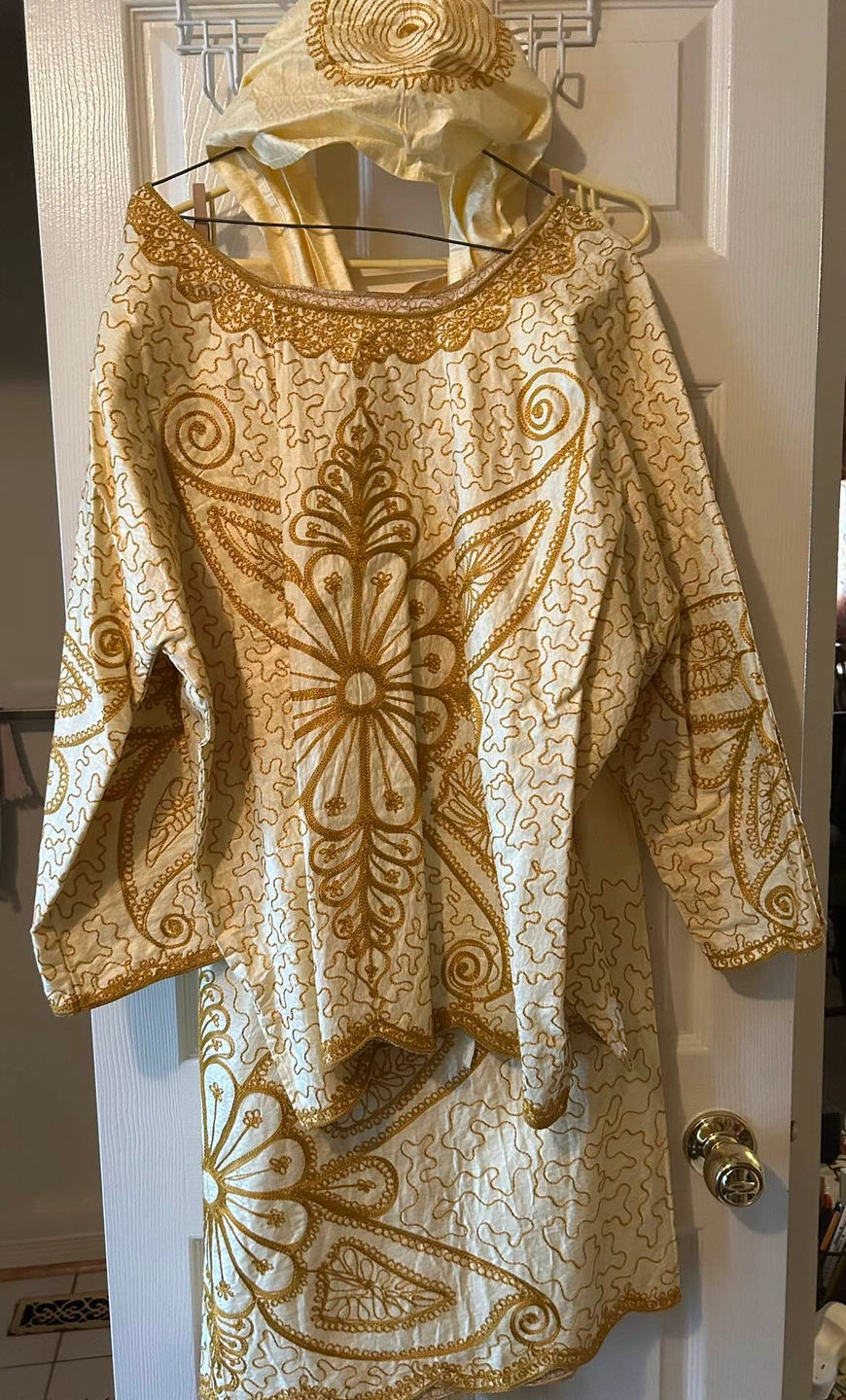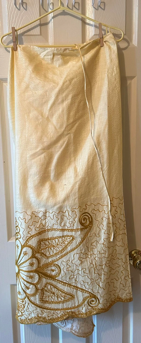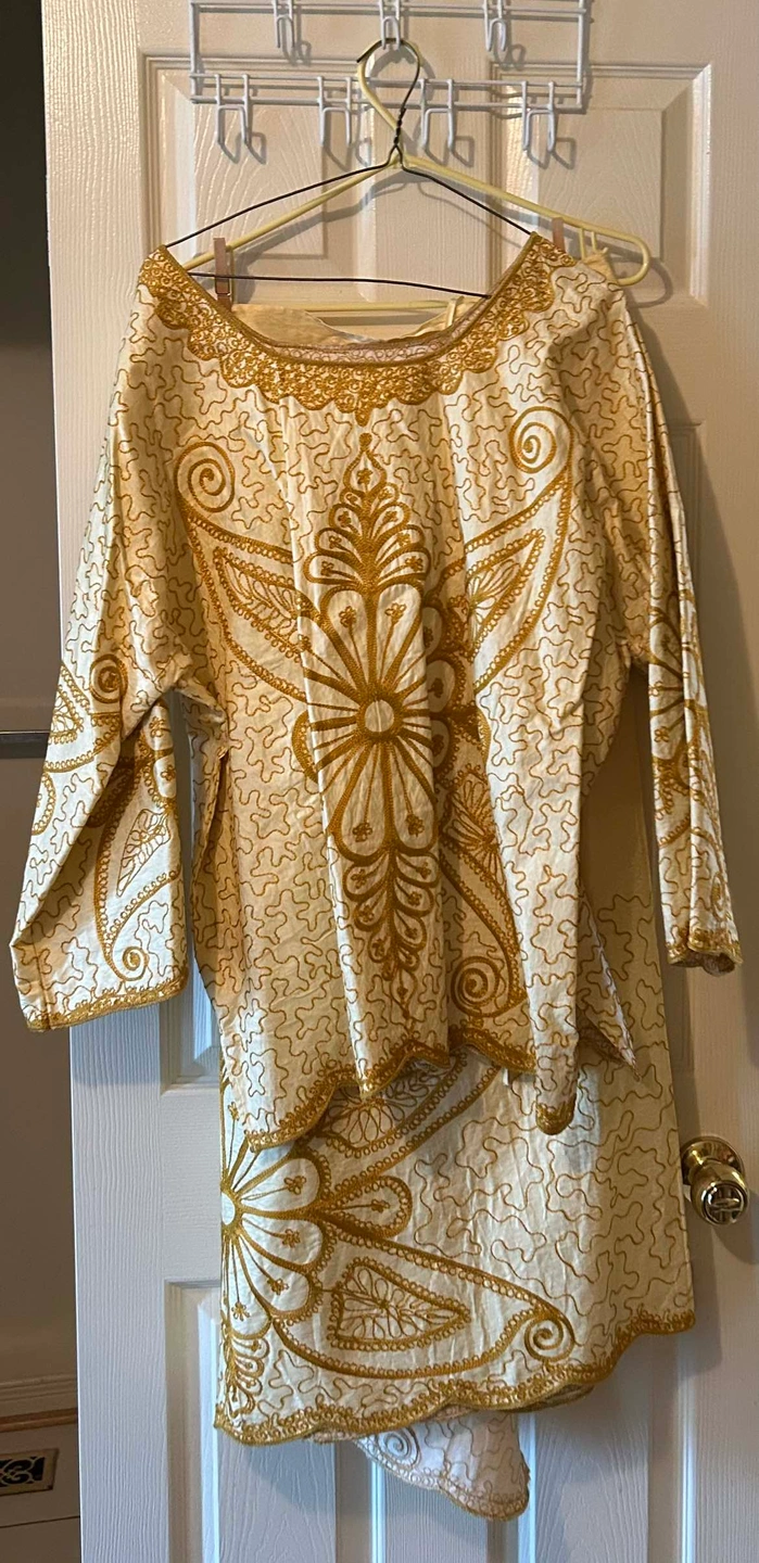 Beautiful golden African women’s 2 piece outfit. Skirt has ties to adjust 2 ur waist.
