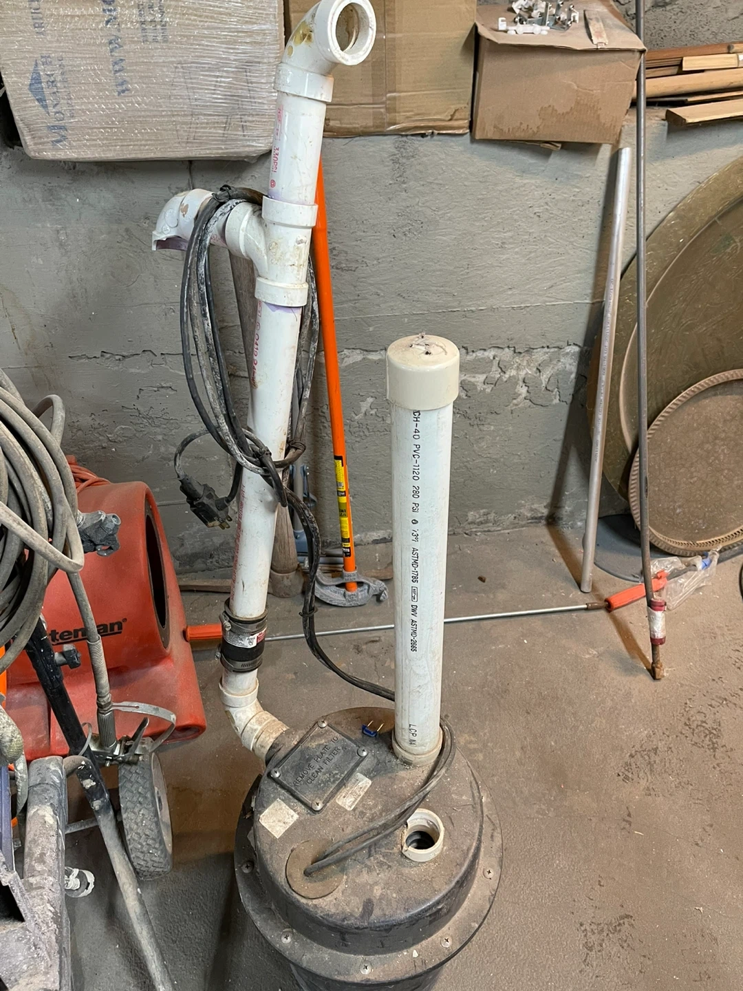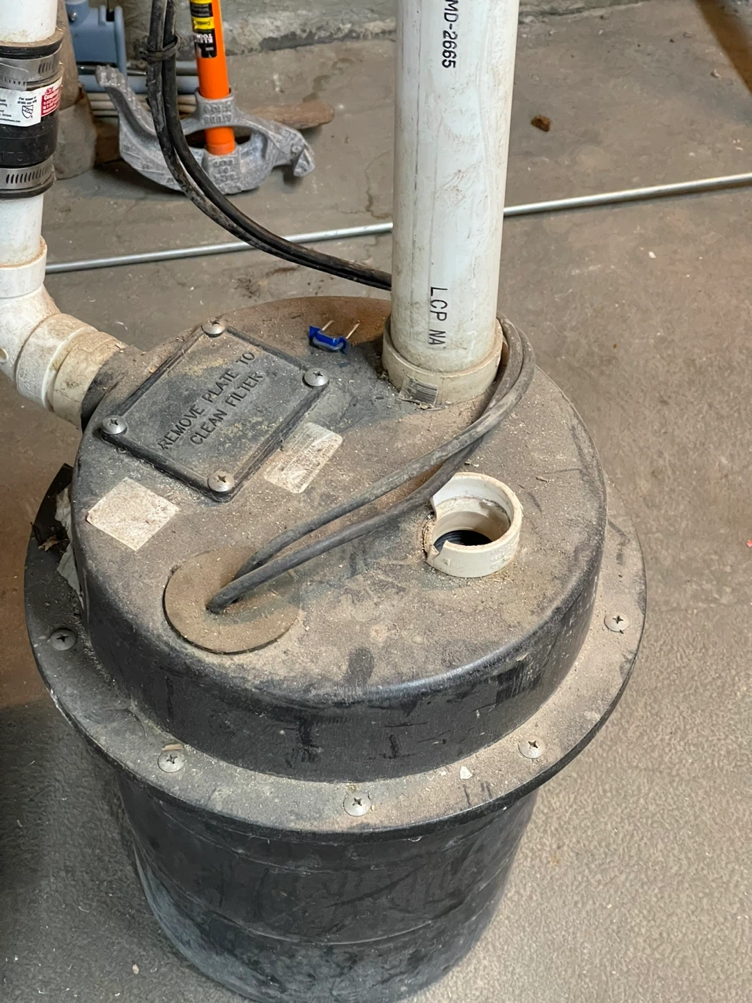 This is a used sump pump assembly. It includes the pump and a connected discharge pipe. The filter access is clearly marked for maintenance.