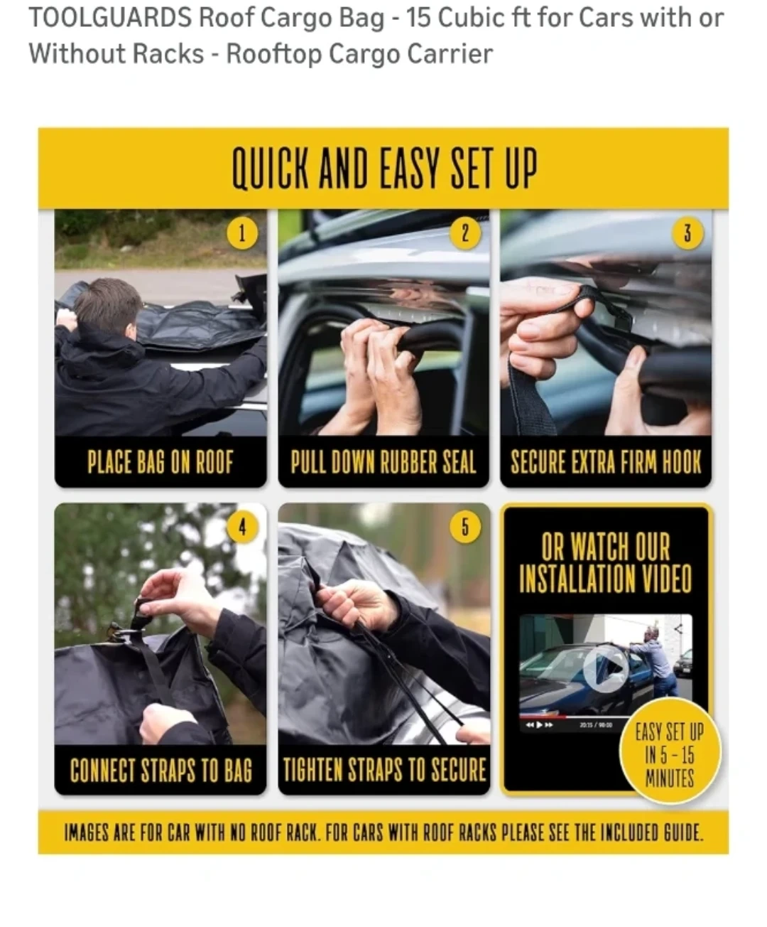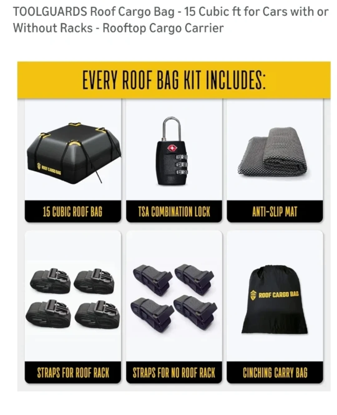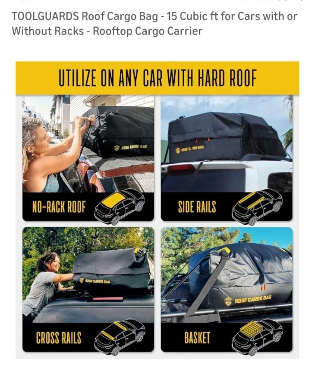 This is a Tool Guards roof cargo bag. It's made of durable material for carrying extra luggage on your car's roof. It's designed to keep your belongings safe and protected during travel.