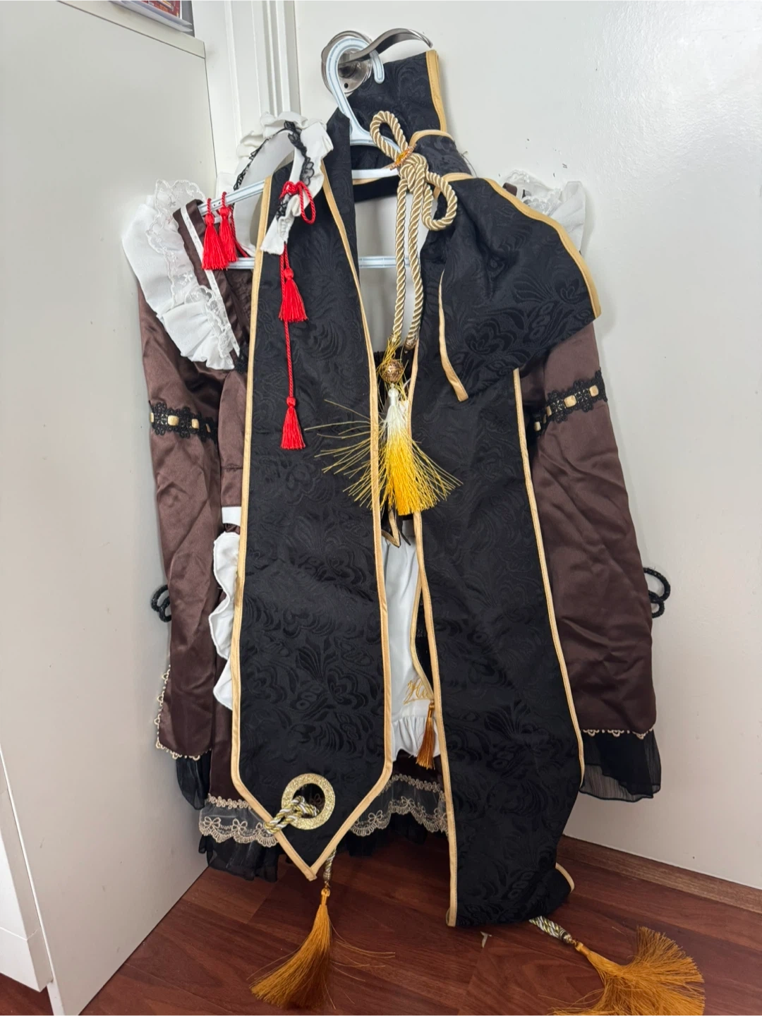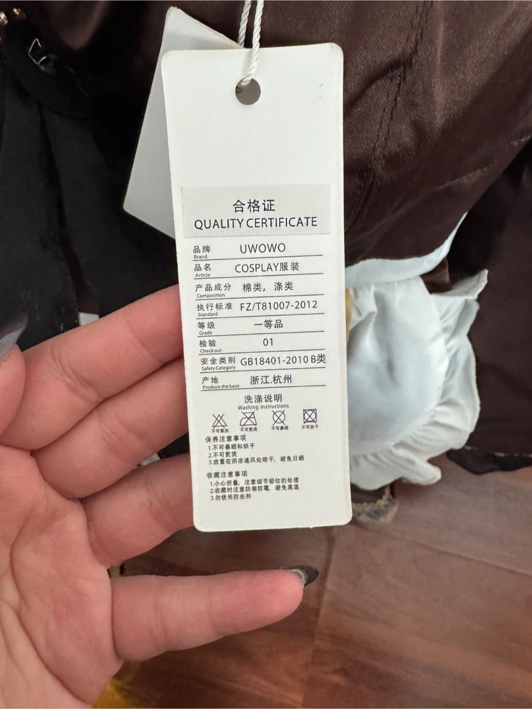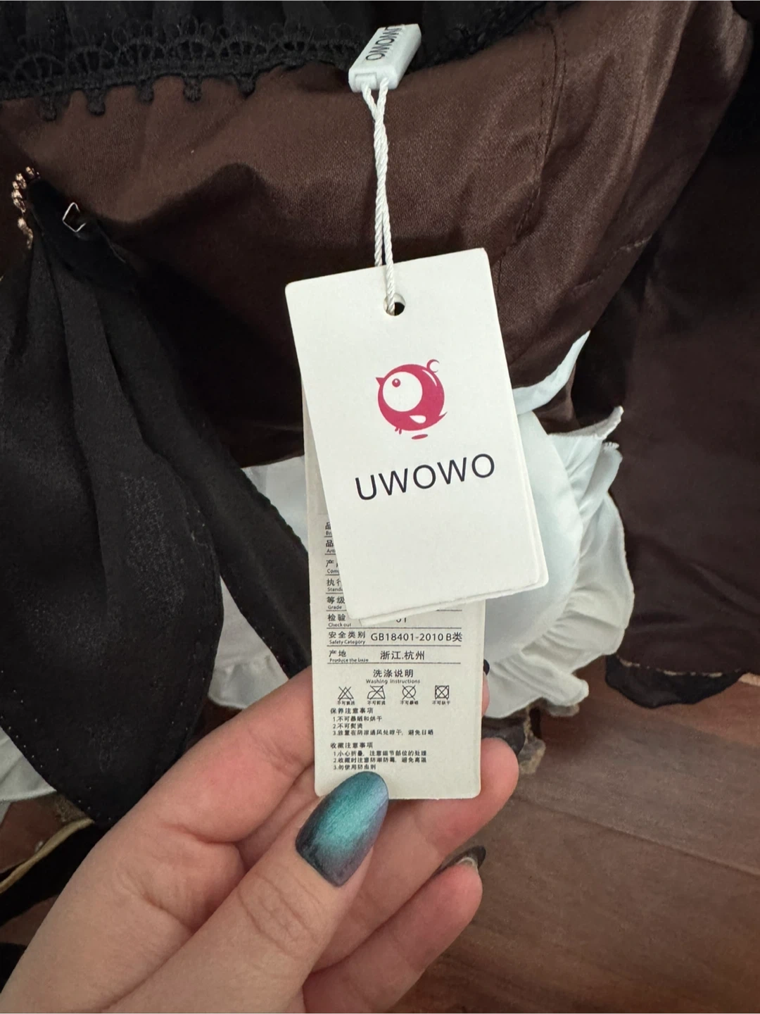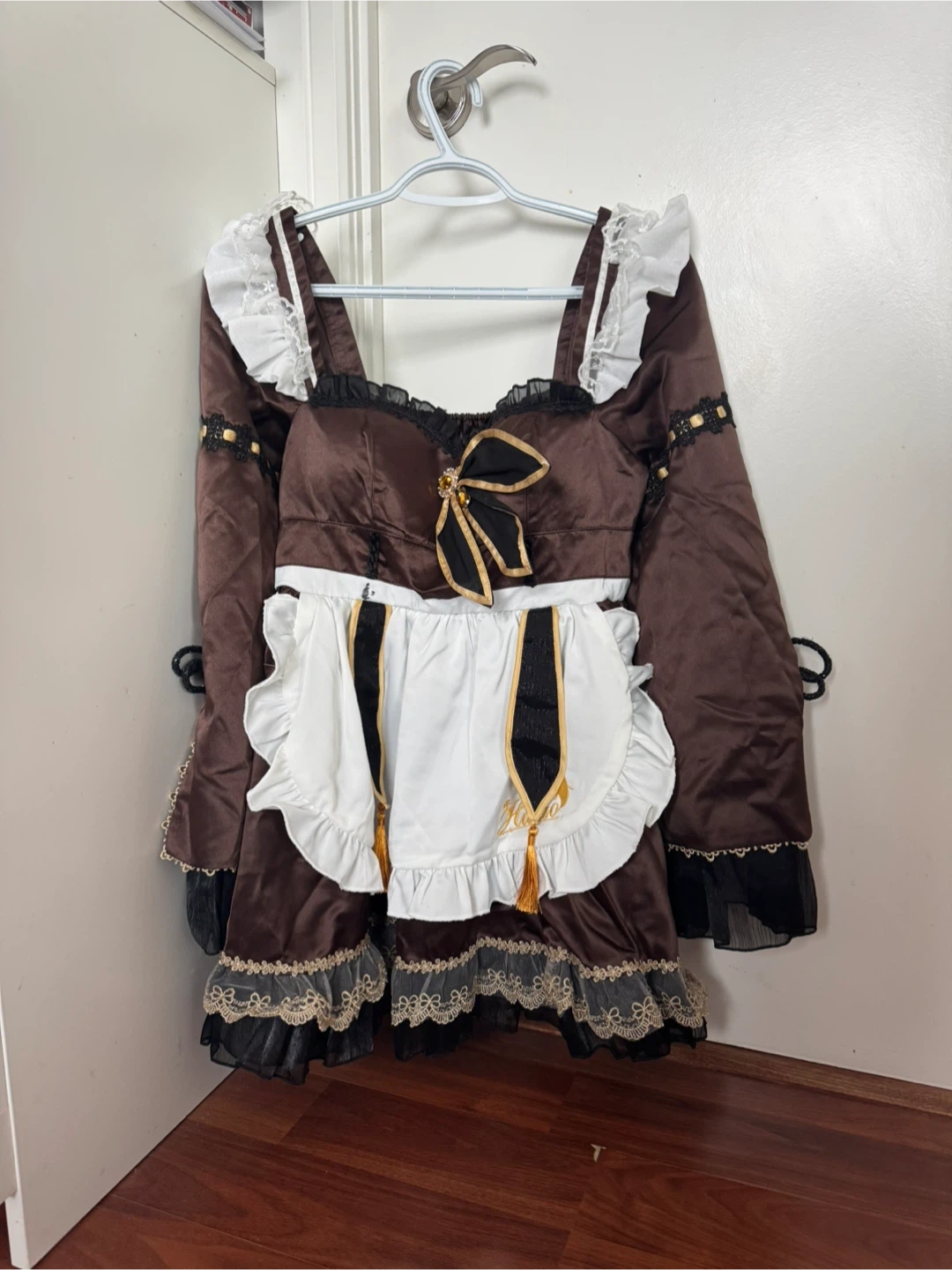This is a UWOWO cosplay costume. It features a brown dress with white lace trim and a black apron. Includes a decorative bow and various accessories. Perfect for cosplay events or themed parties!