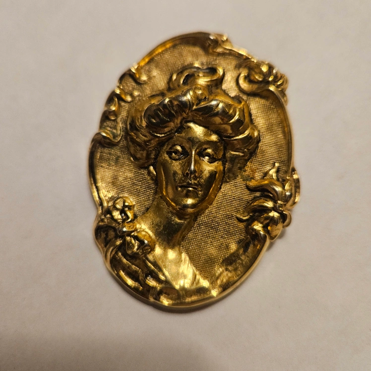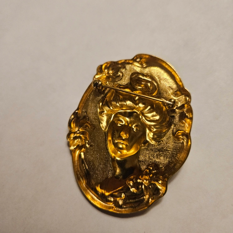 Vintage 1910s NOUVEAU gold tone brooch Gibson girl in an oval frame. The brooch features detailed floral accents around the frame.