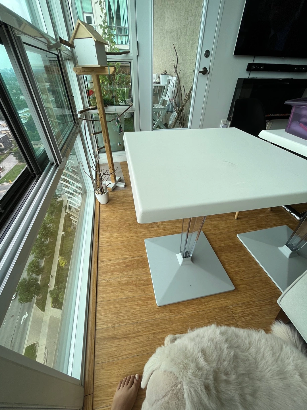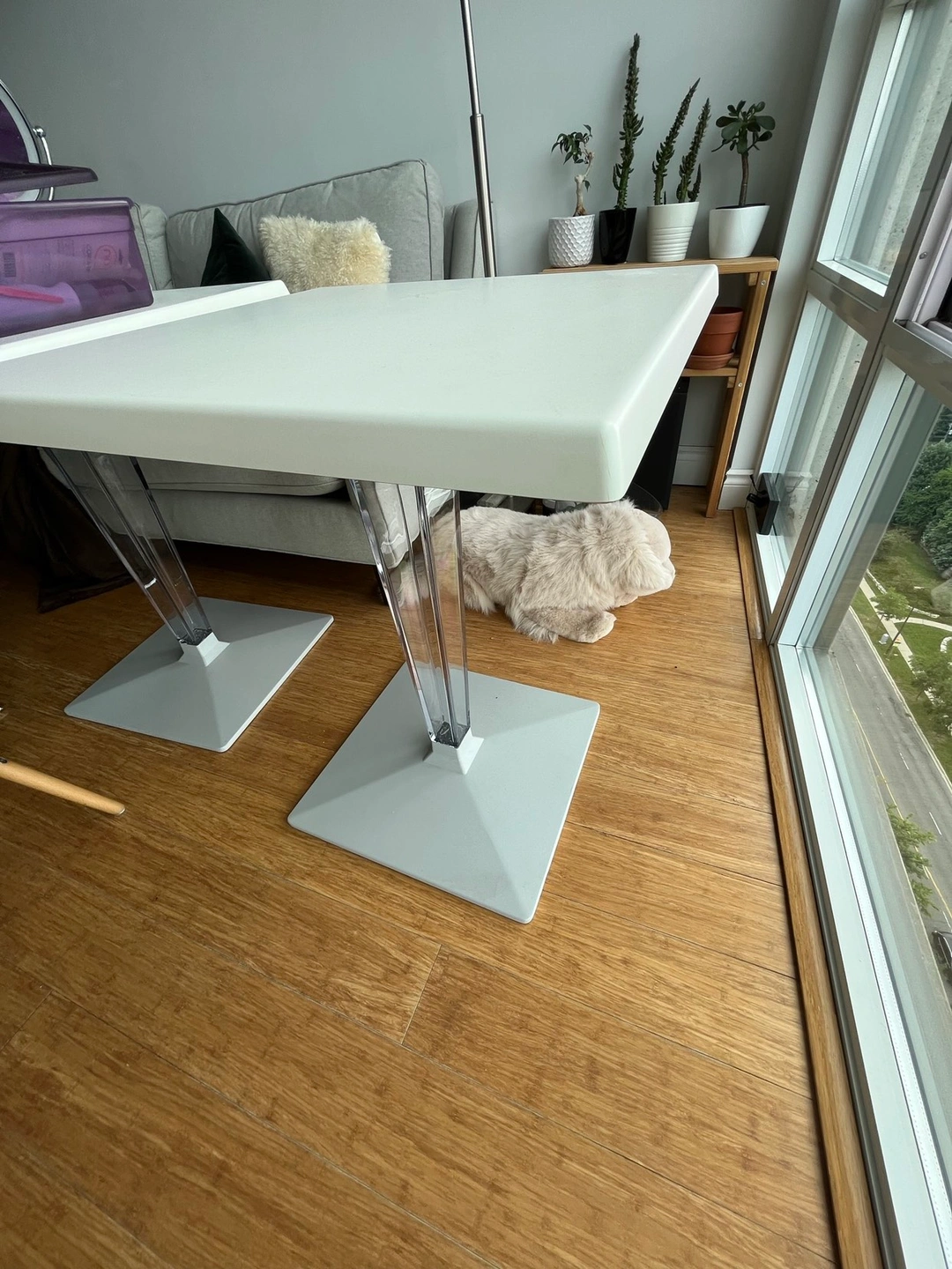 Beautiful modern white tables available, perfect for either outdoors or indoors. Stylish. The price is for each, however, one of them has a chip on one the corners. I’m happy to give you a discount.