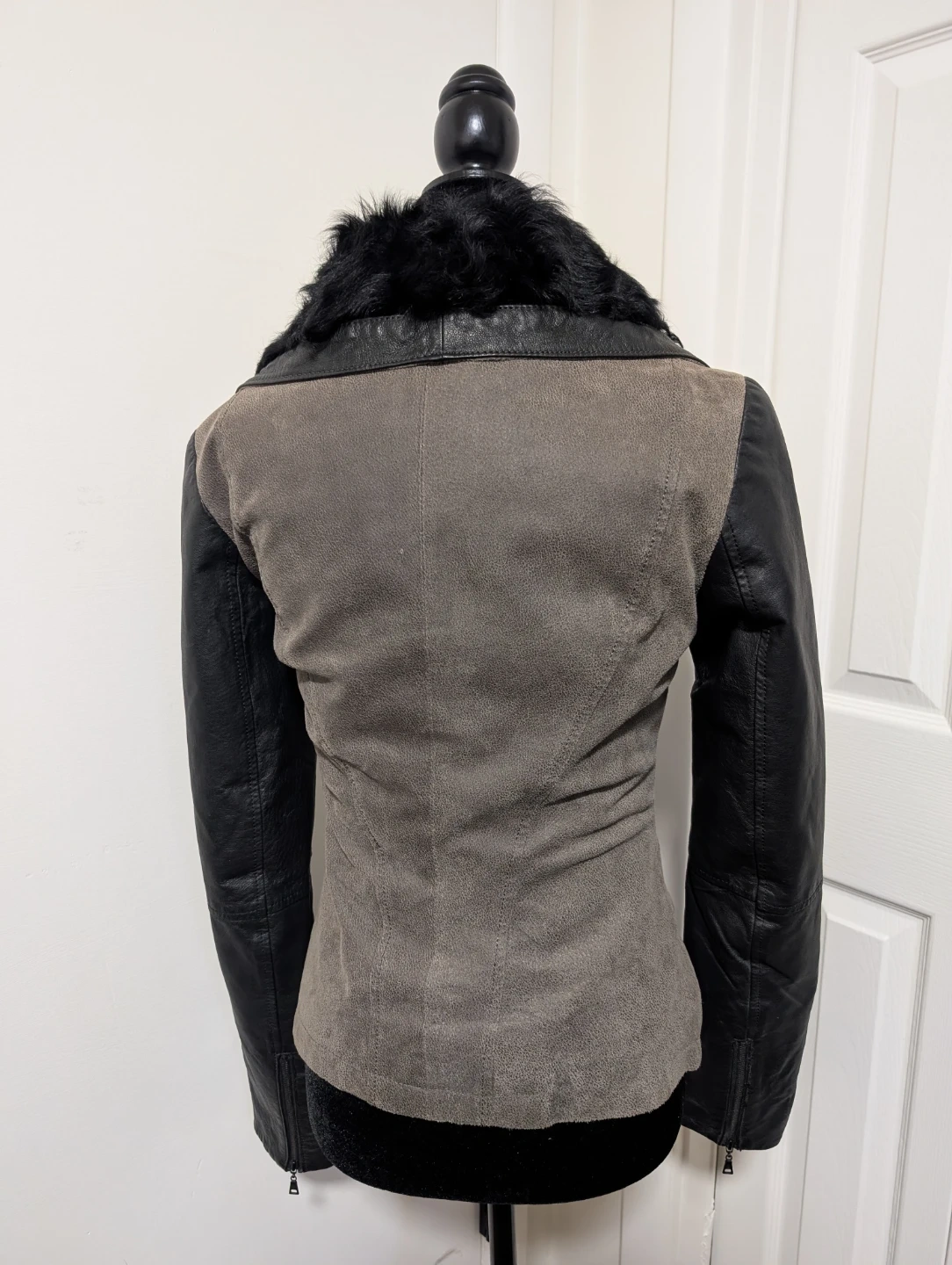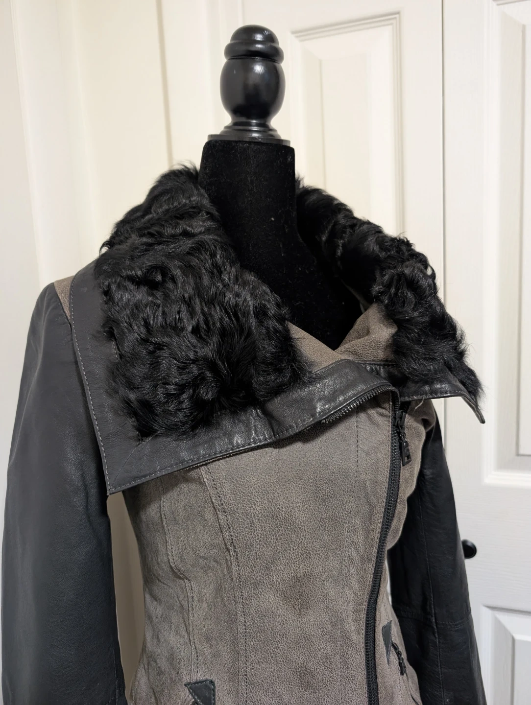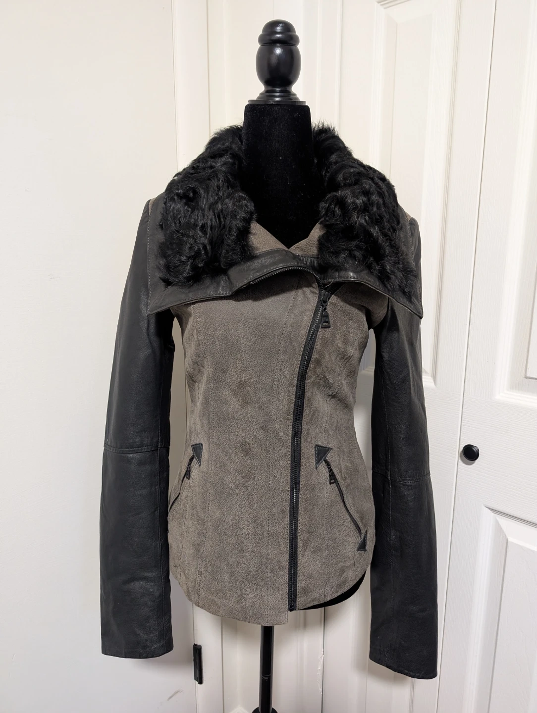 Danier moto jacket featuring a mix of black leather and grey suede. It has a soft black fur collar and zippered pockets. This stylish jacket is perfect for cooler weather!
