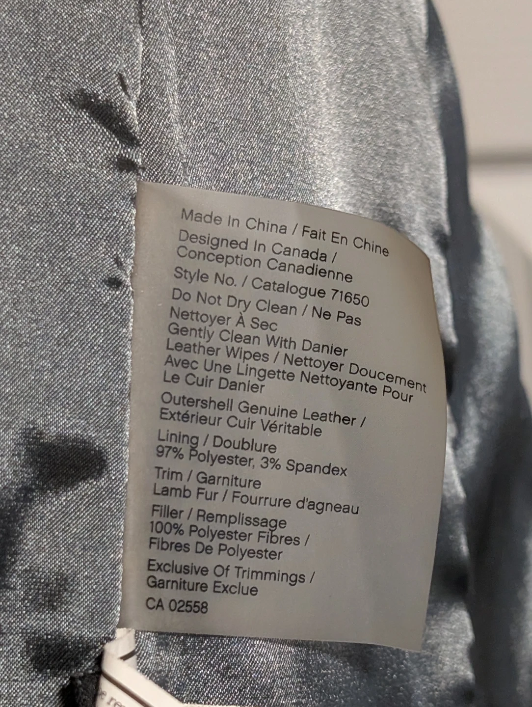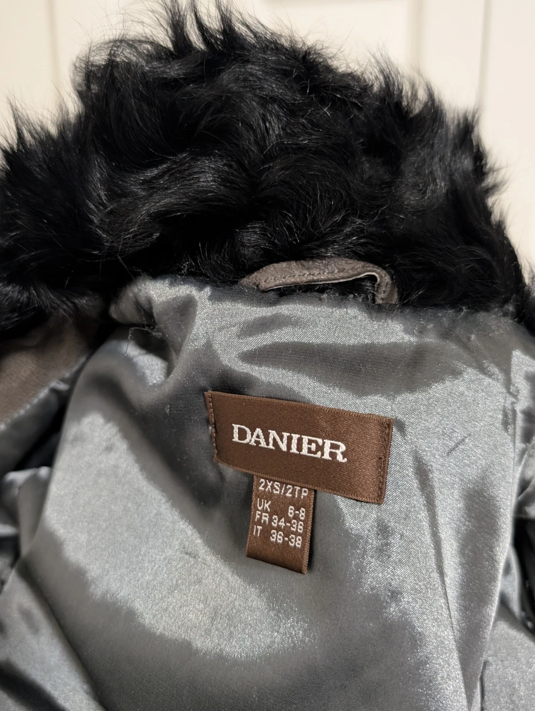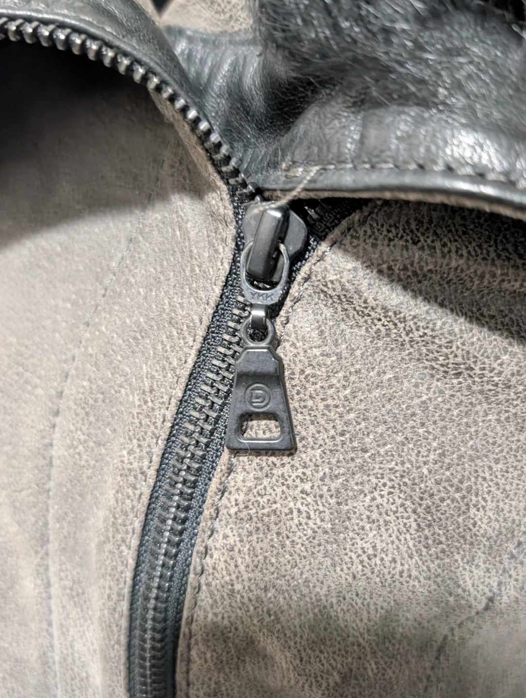 Danier moto jacket featuring a mix of black leather and grey suede. It has a soft black fur collar and zippered pockets. This stylish jacket is perfect for cooler weather!