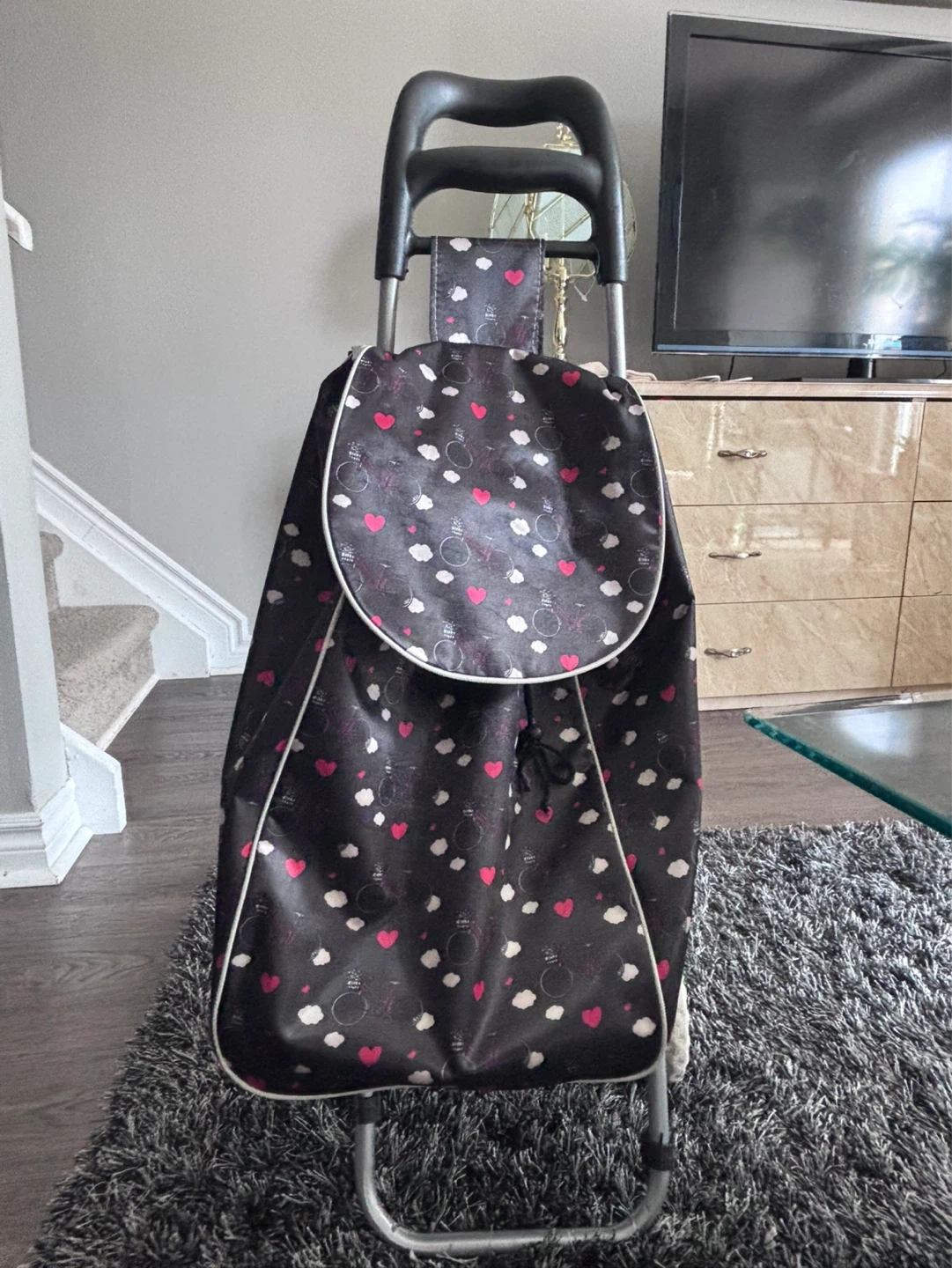 This shopping trolley bag features a fun black design with pink hearts and white clouds. It has a sturdy frame with a comfortable handle for easy transport. Great for groceries or errands!