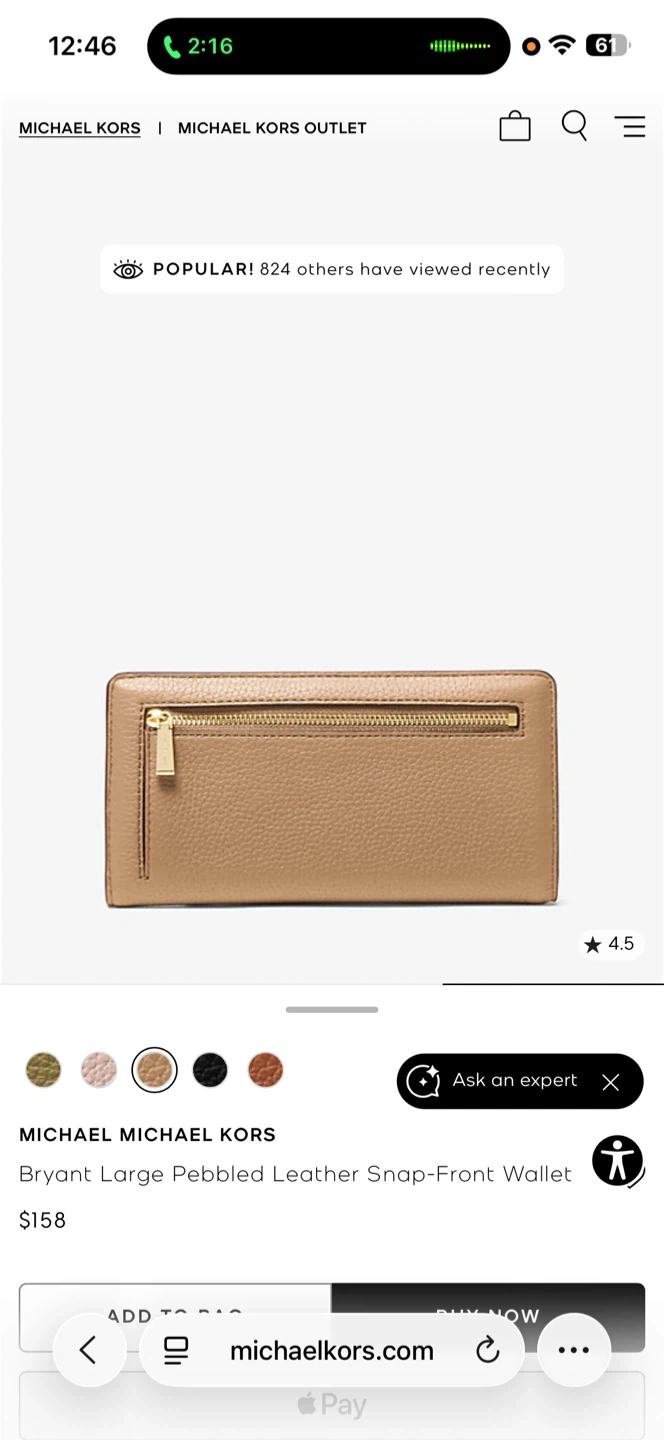 Michael Kors Bryant Large Snap-Front Wallet in pebbled leather. It has multiple card slots and a zip coin pocket. This wallet is a great size for everyday use.