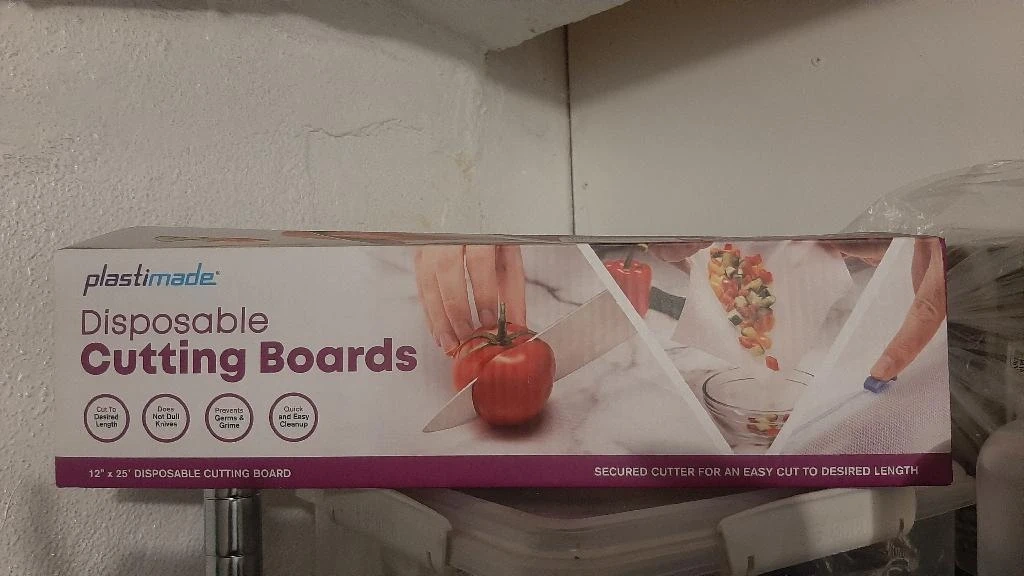 Disposable cutting boards from Plastimade. It's 12" x 25" and comes with a secured cutter for easy cutting to your desired length. These boards prevent germs and grime and offer quick, easy cleanup!