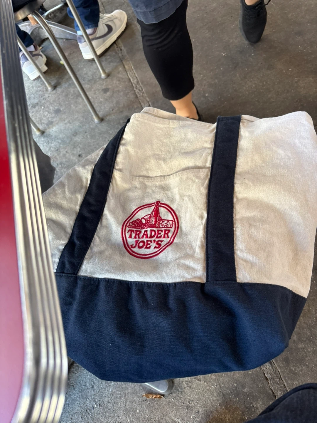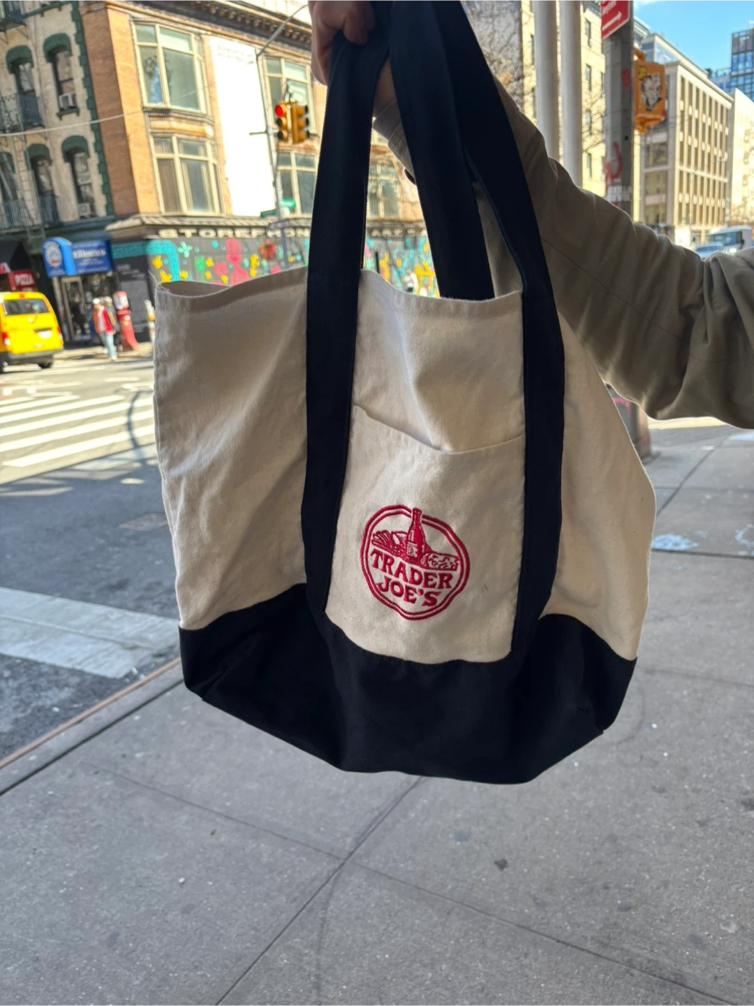 This is a Trader Joe's canvas tote bag. It's made of durable fabric with sturdy straps. There's an exterior pocket for easy access.