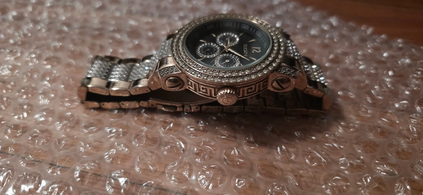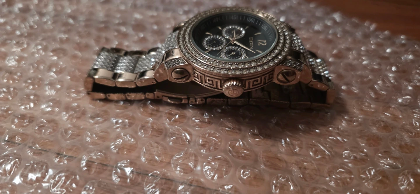 This Elgin watch features a black dial with crystal accents on the bezel and band. It's made of stainless steel and has a Japan movement. Water resistant up to 100ft. Needs a battery
