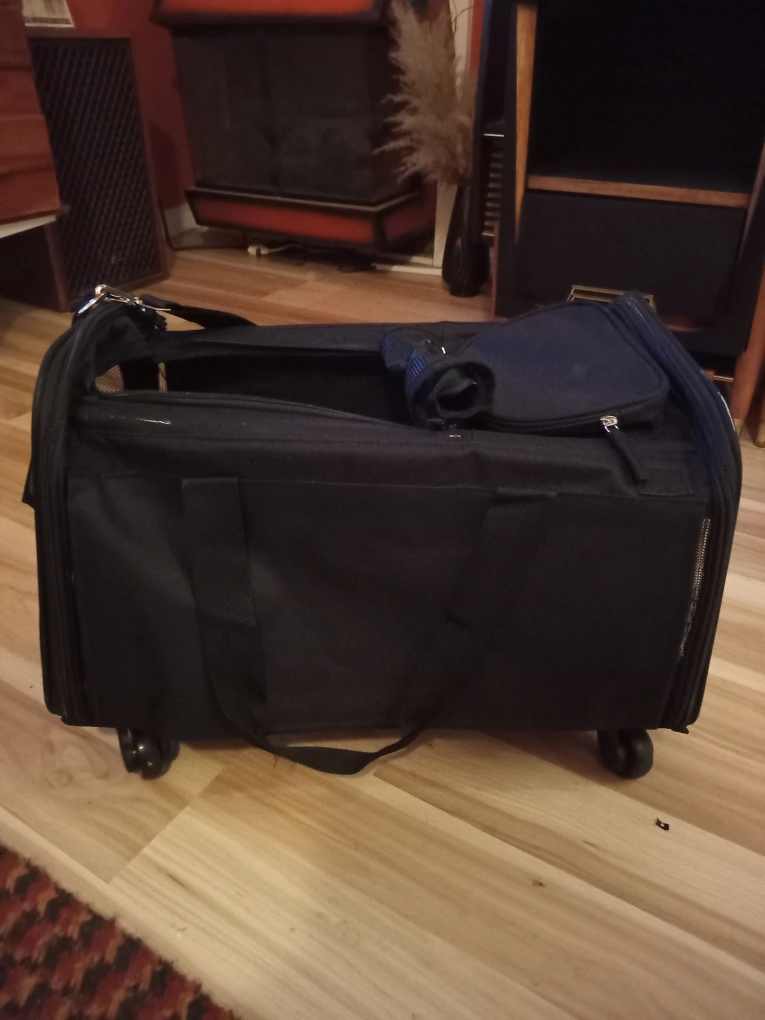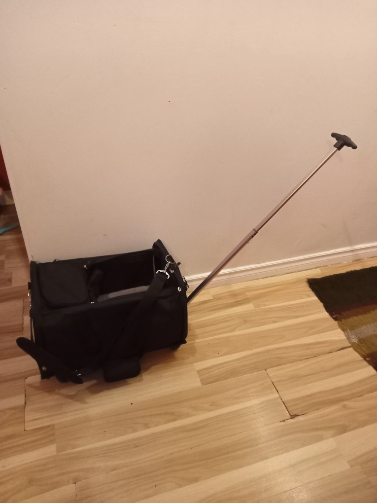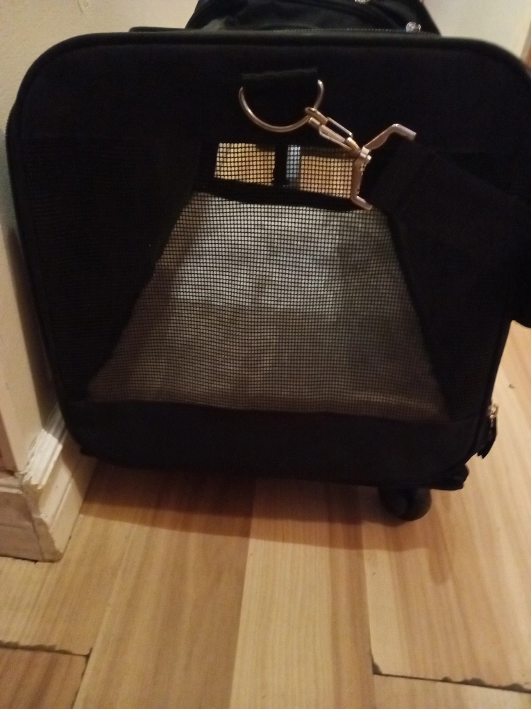 Pet carrier on wheels with extendable handle and shoulder straps. Mesh windows on all sides that can either be exposed or be covered on the sides.