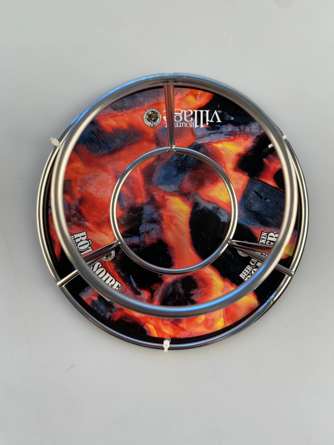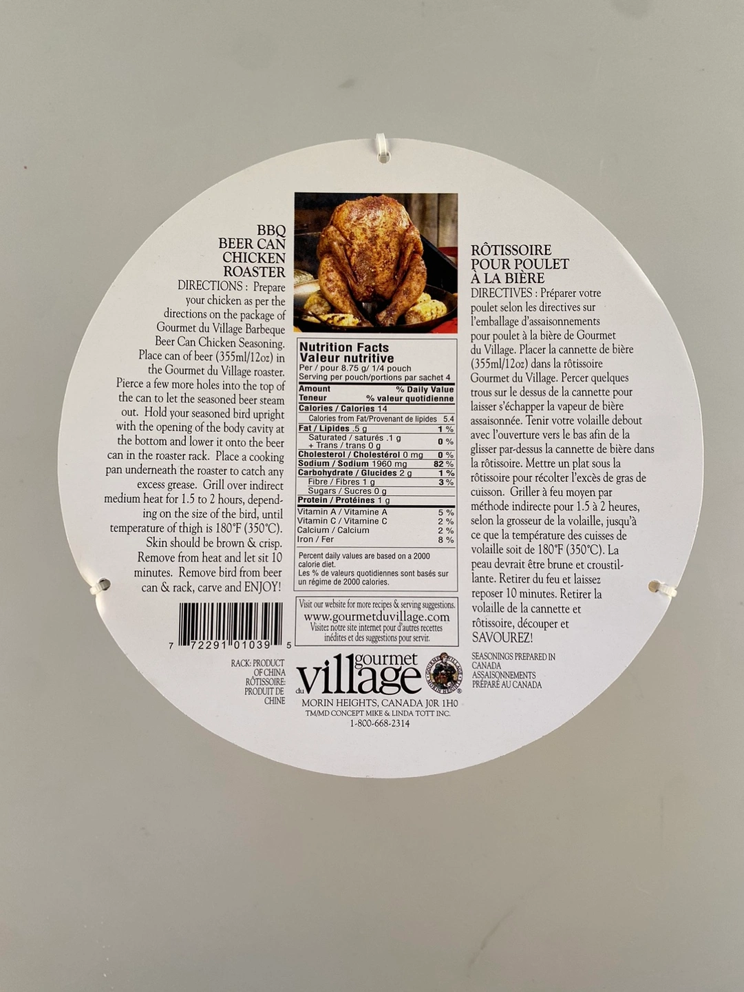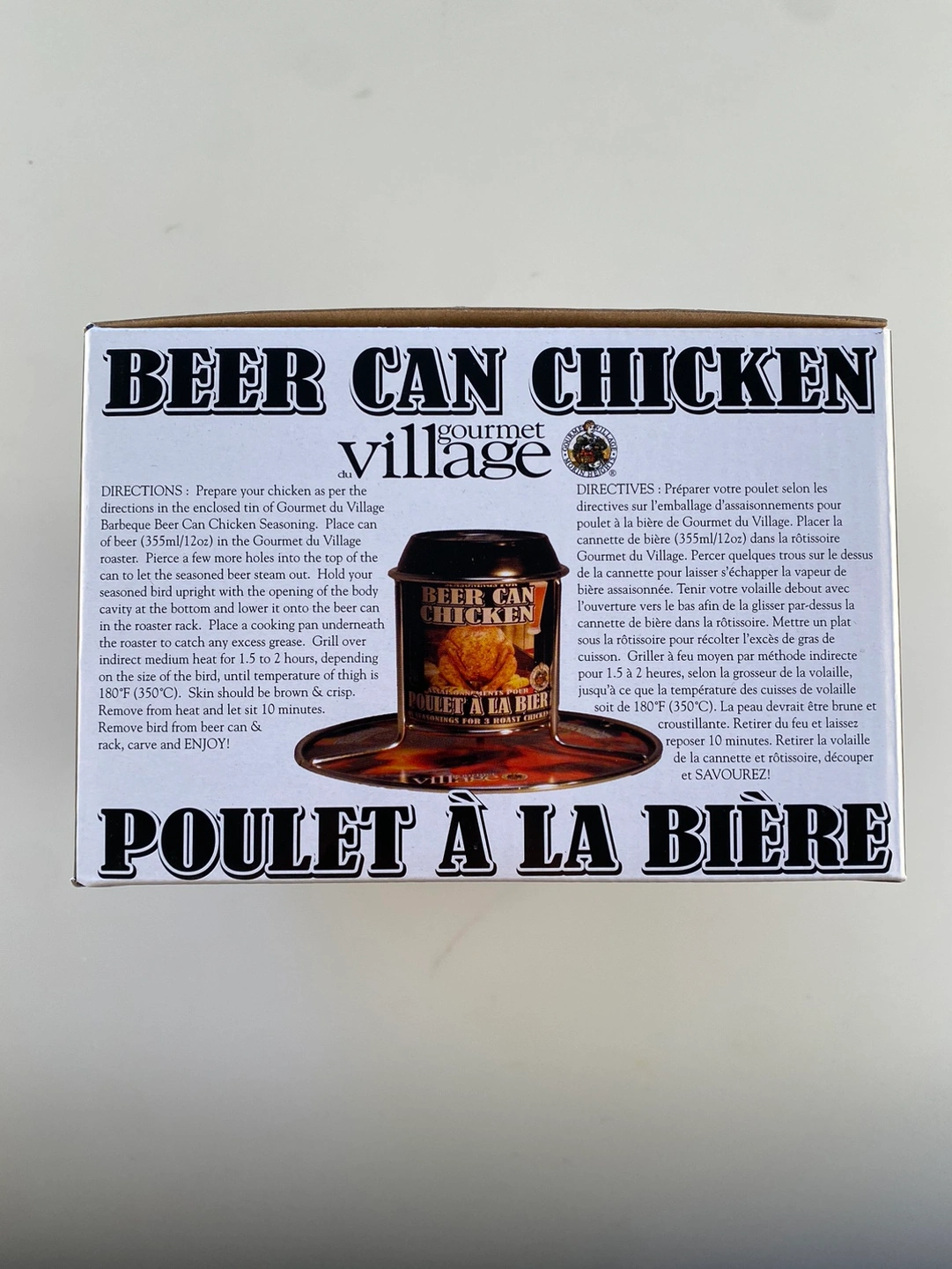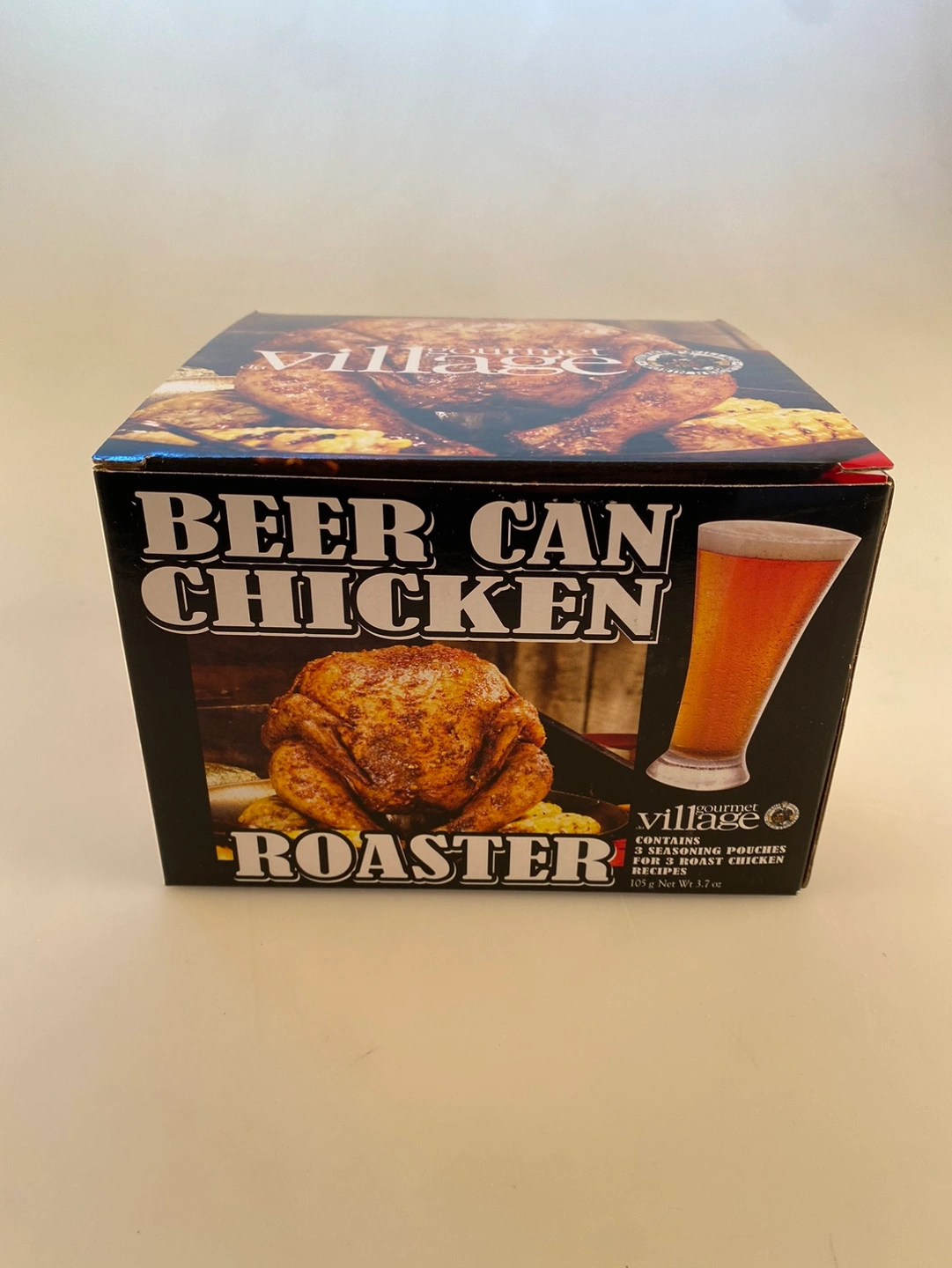 Fire up the BBQ, because it’s time for some tasty beer can chicken. This handy steel wire roasting rack is made by Gourmet Village. New in box. I tossed the 10+ year old seasoning mix. Grab a beer for you and your chicken - you won’t regret it!