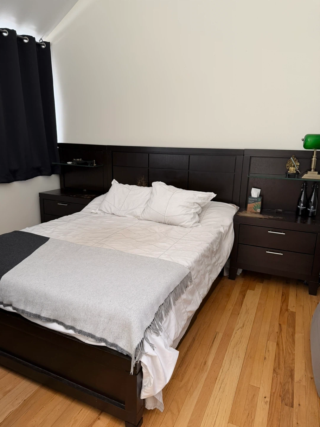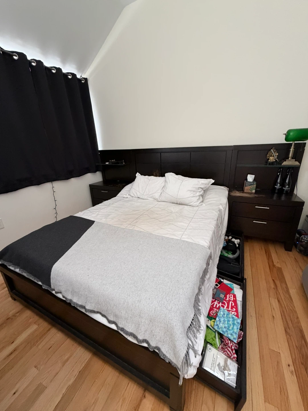 Queen size bed frame in a dark brown finish. Includes two integrated nightstands with two drawers each. Two storage drawers are built into the bed frame for extra space on the left side. Wooden construction.