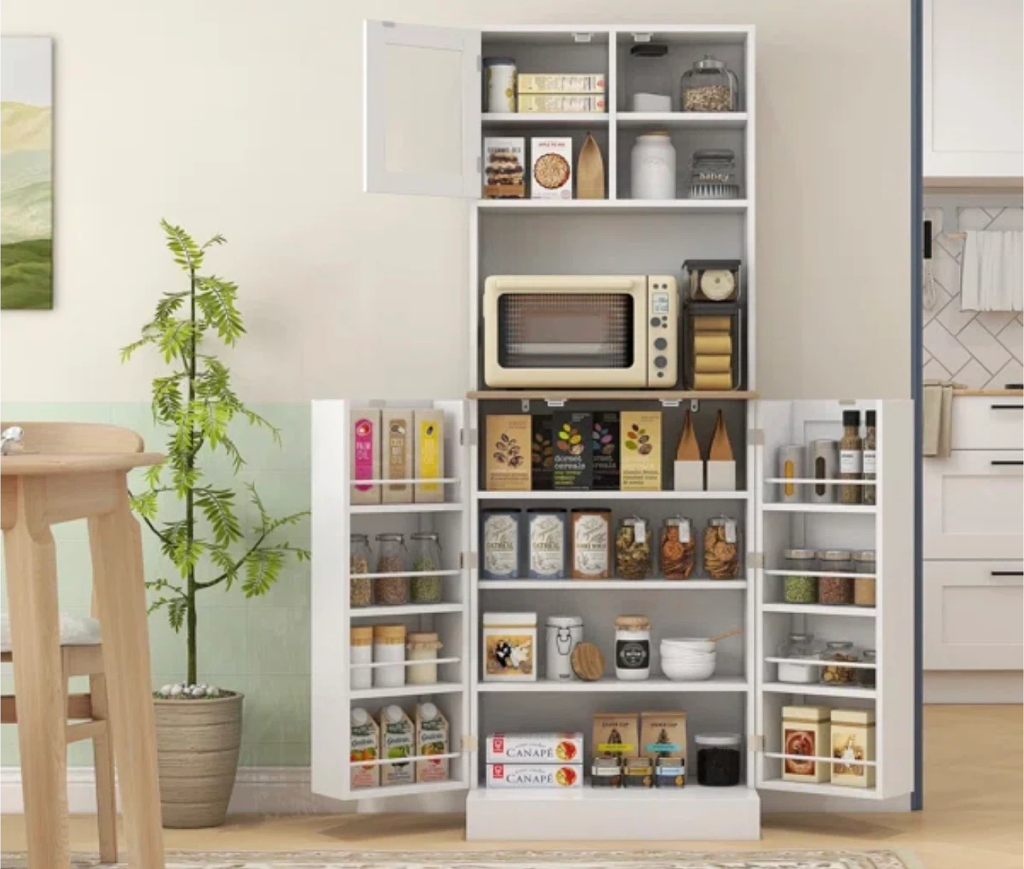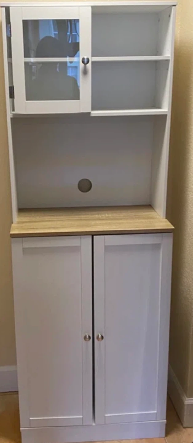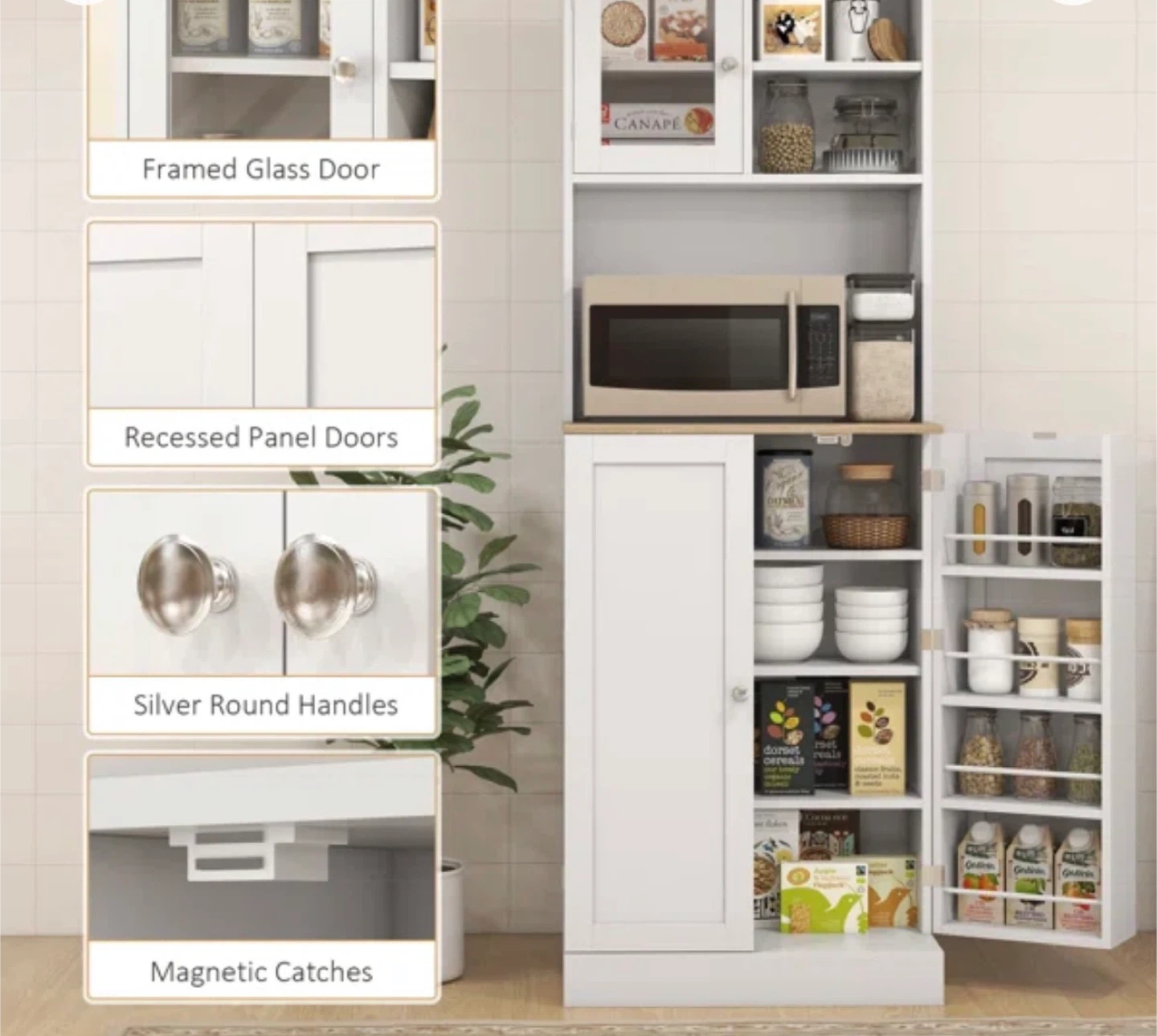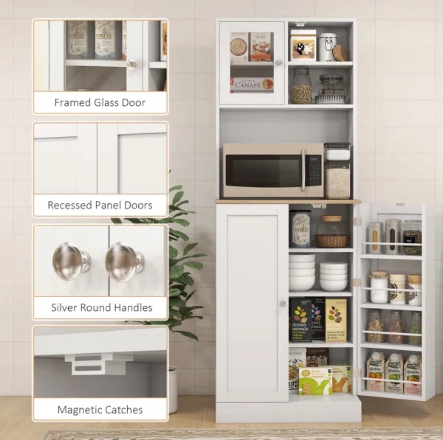 This kitchen pantry cabinet features recessed panel doors and silver round handles. It has multiple shelves for organized storage, including a framed glass door at the top. Magnetic catches keep the doors securely closed. Microwave table.