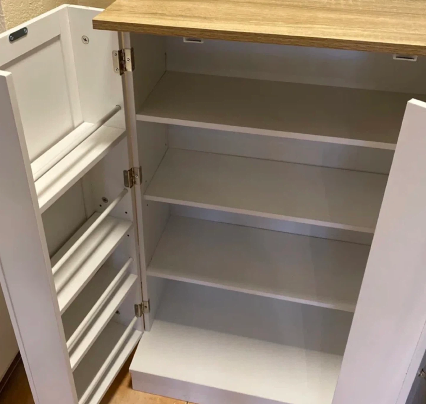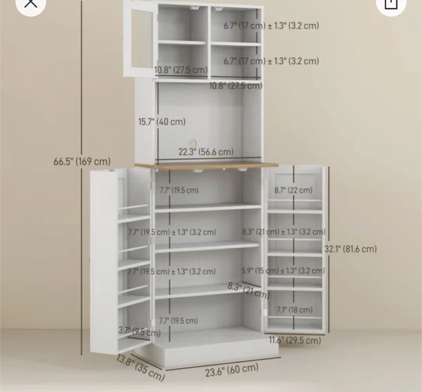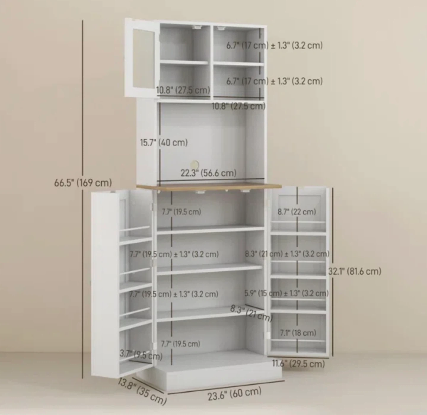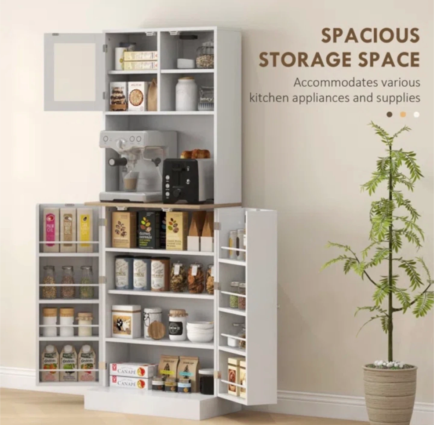 This kitchen pantry cabinet features recessed panel doors and silver round handles. It has multiple shelves for organized storage, including a framed glass door at the top. Magnetic catches keep the doors securely closed. Microwave table.
