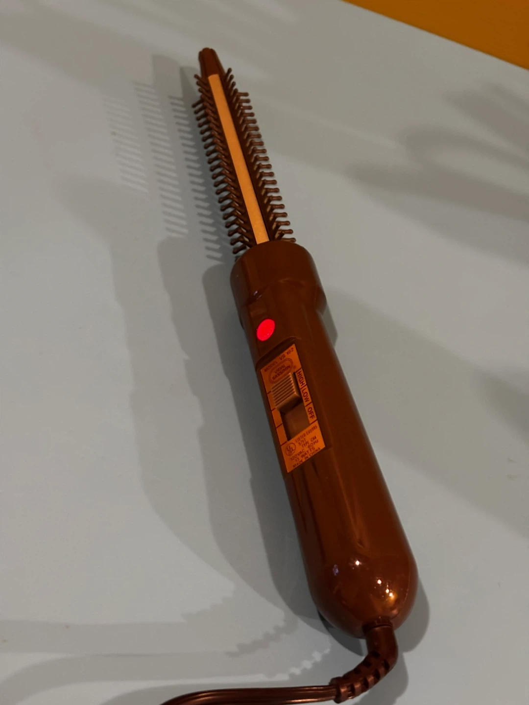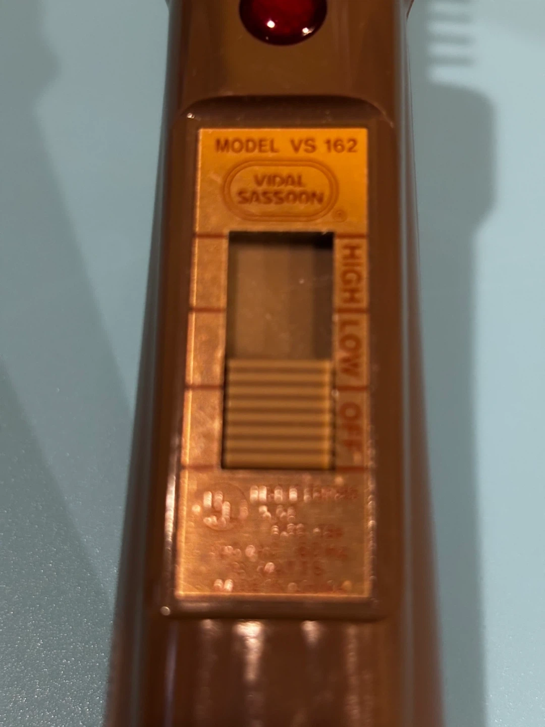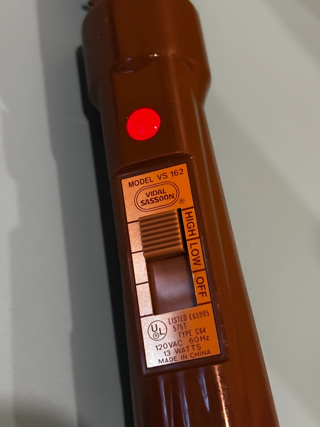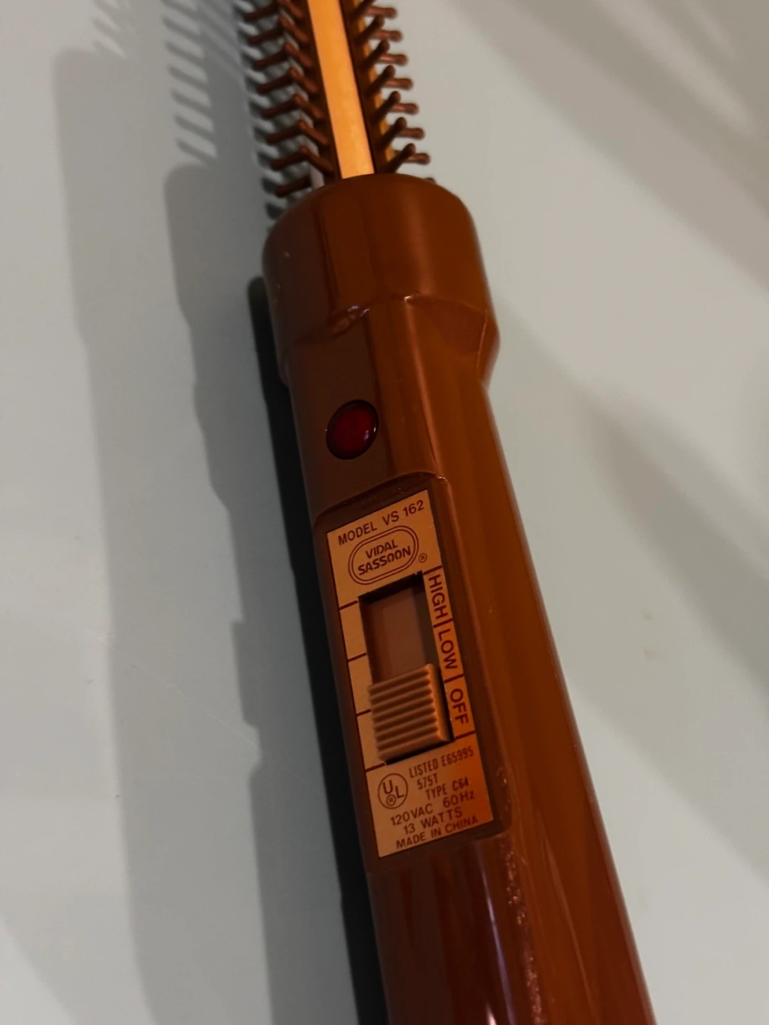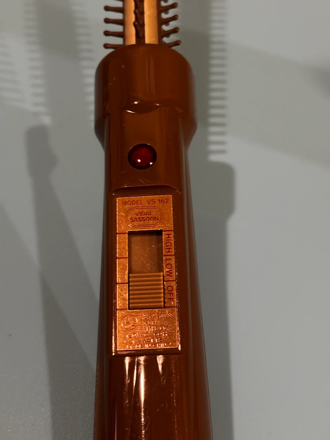 Vidal Sassoon VS 162 model hot air brush. Features high, low, and off settings. 120VAC, 60Hz, 13 Watts.