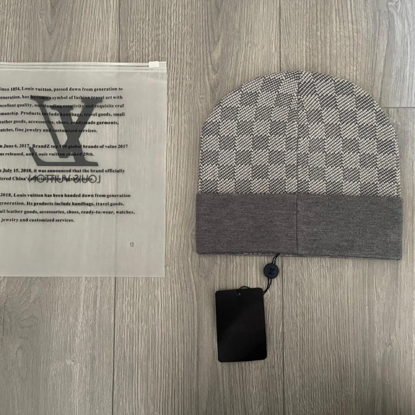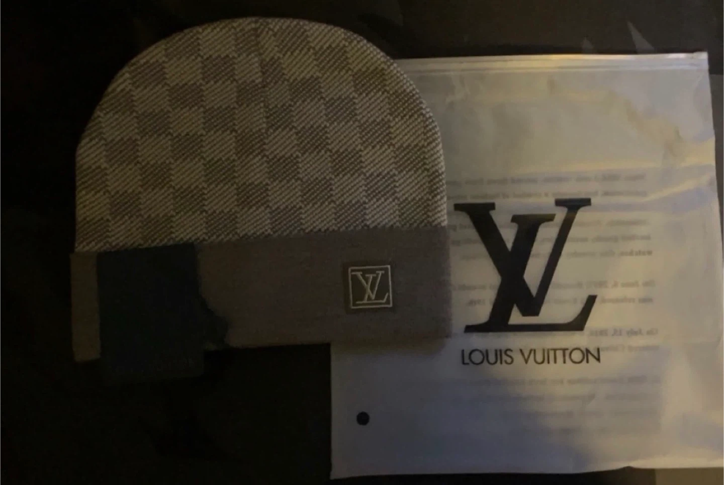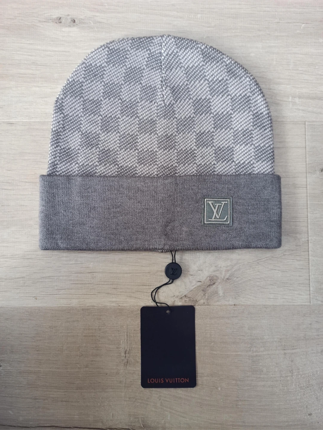 Louis Vuitton beanie hat in grey with signature monogram pattern. It's made from a knit material. Includes original packaging.