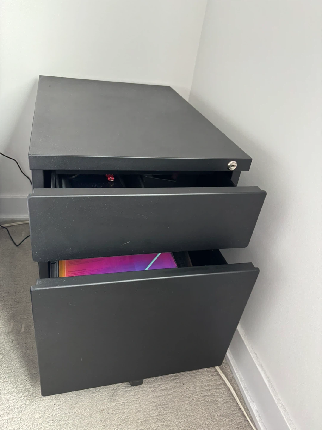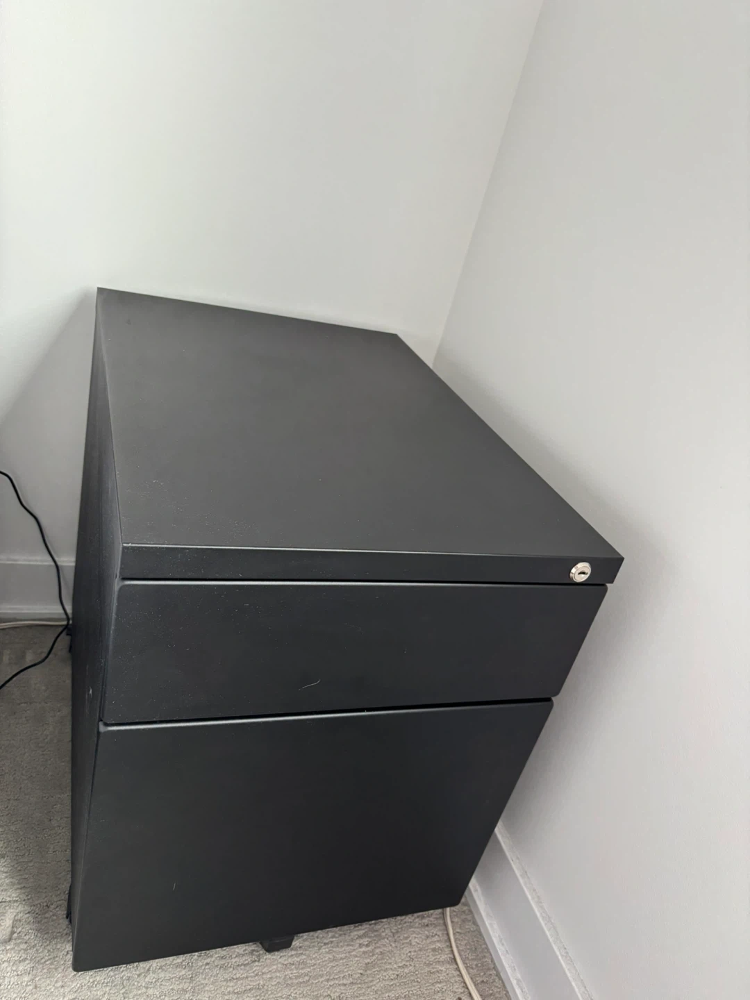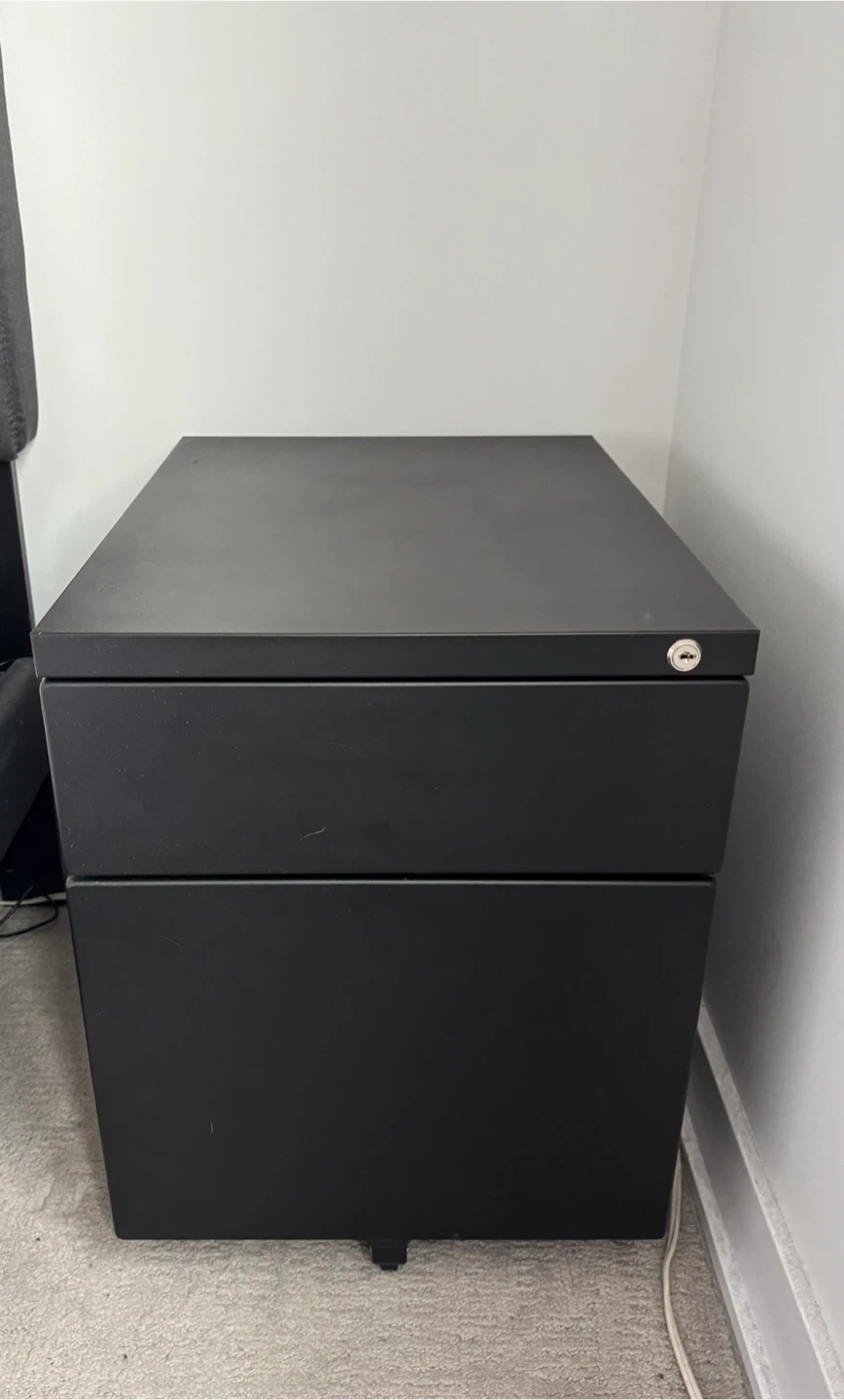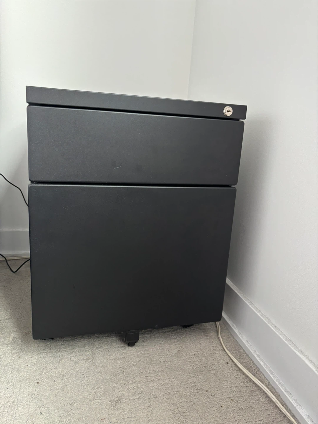This is a black metal rolling filing cabinet with two drawers (big spaces) and locker.