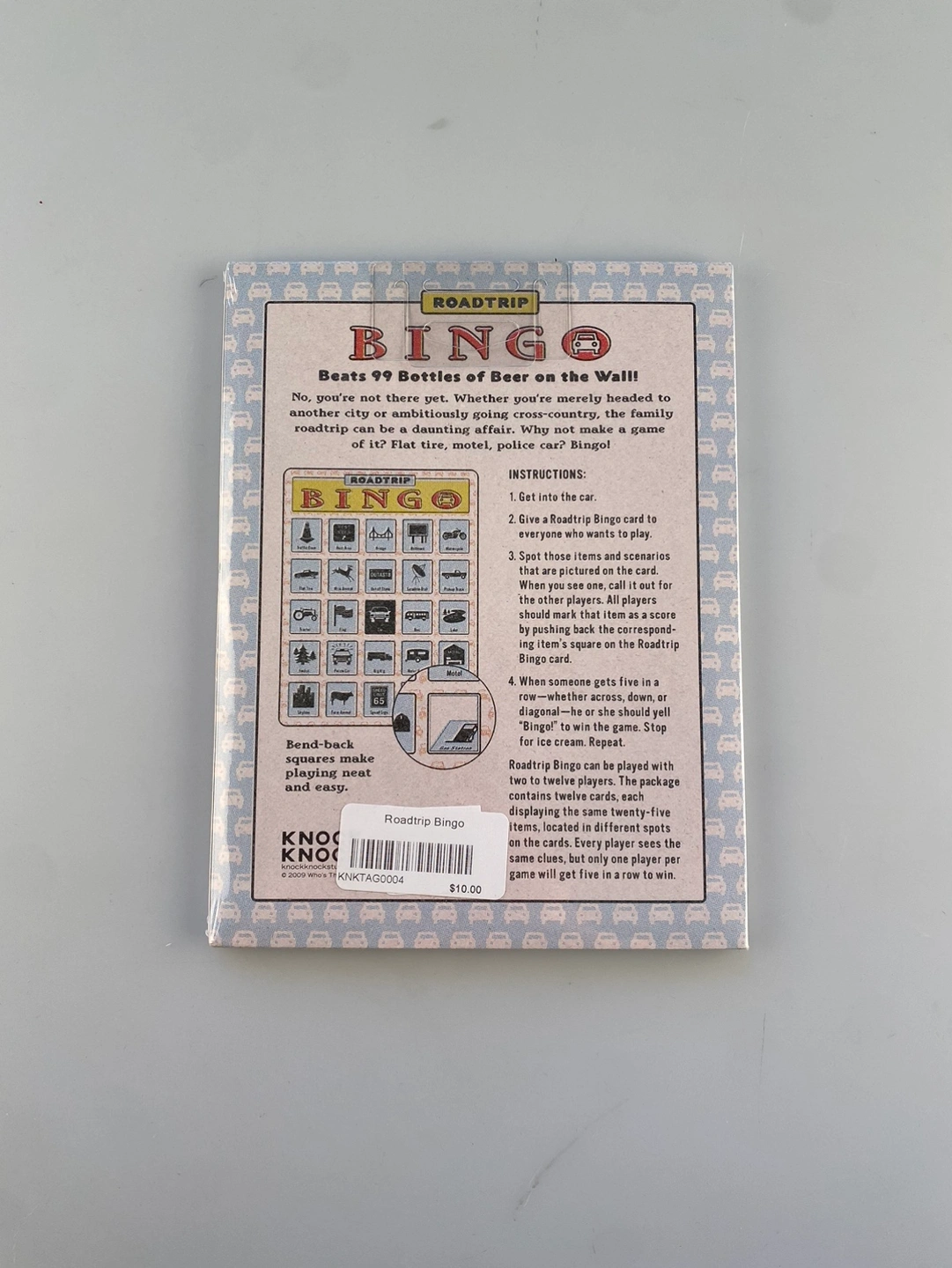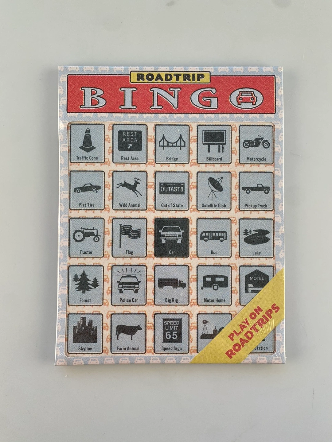 BINGO! Next time you get into your car for a long road trip have some extra fun with Roadtrip Bingo. Who will be the first to get 1 line , 2 lines or a full card? Comes with 12 identical paper cards so that you can play with 2 player or more. Made by Knock Knock, these Bingo cards are approximately 8.5” x 6.25”.