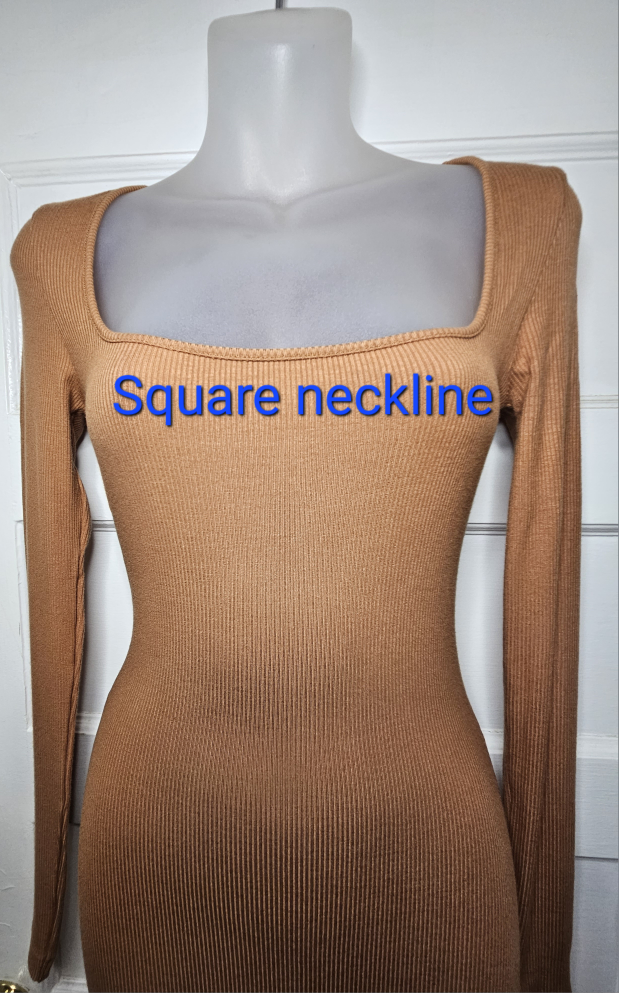 Square neck, long sleeve, ribbed bodycon Dress