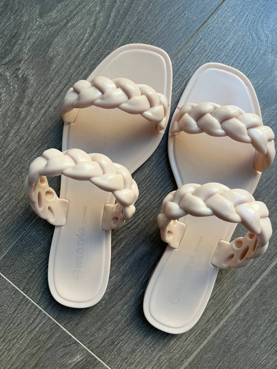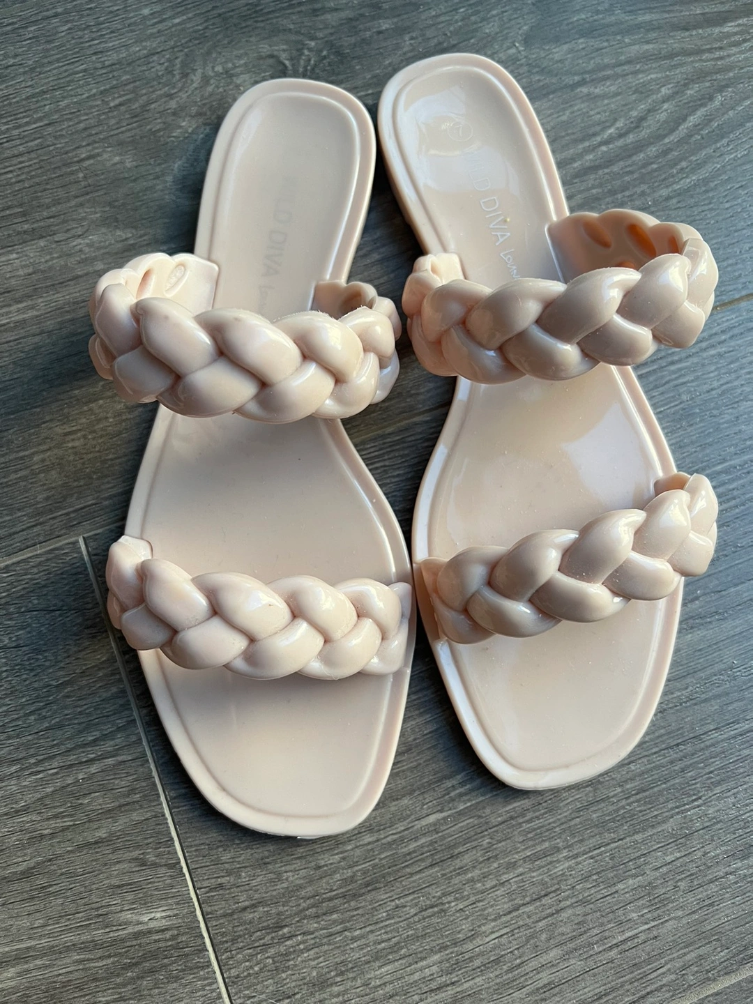 Brand new flat sandal with braided stripe. Beige colour and in intact condition.