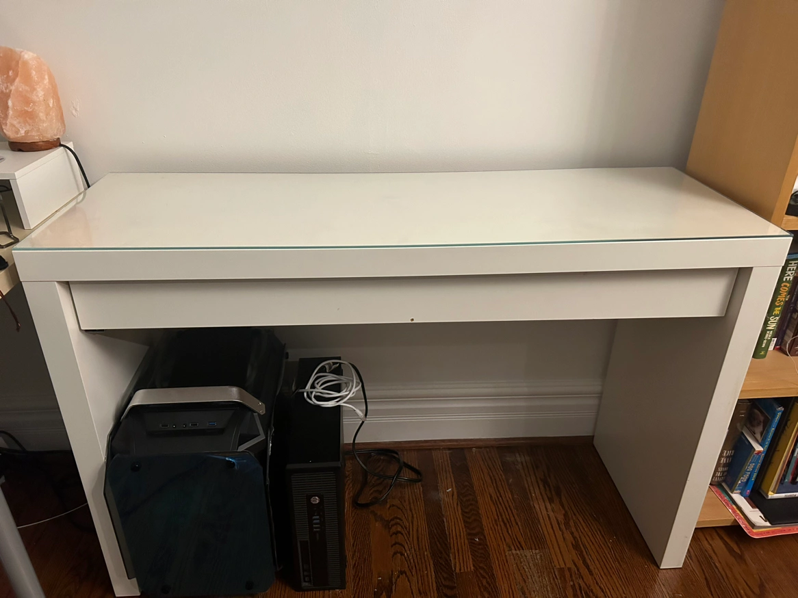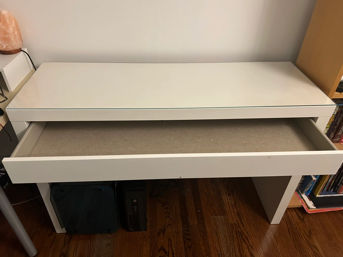 White desk with glass top. Everything is fully functional and in perfect condition, except for a small chip in the front and a few scrapes on the legs. The glass top is loose and not stuck on.