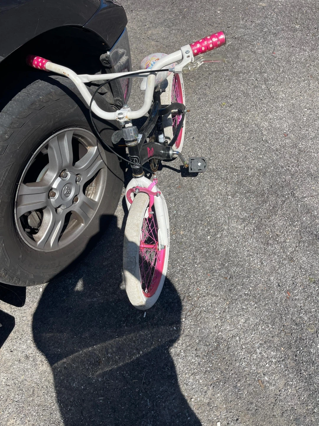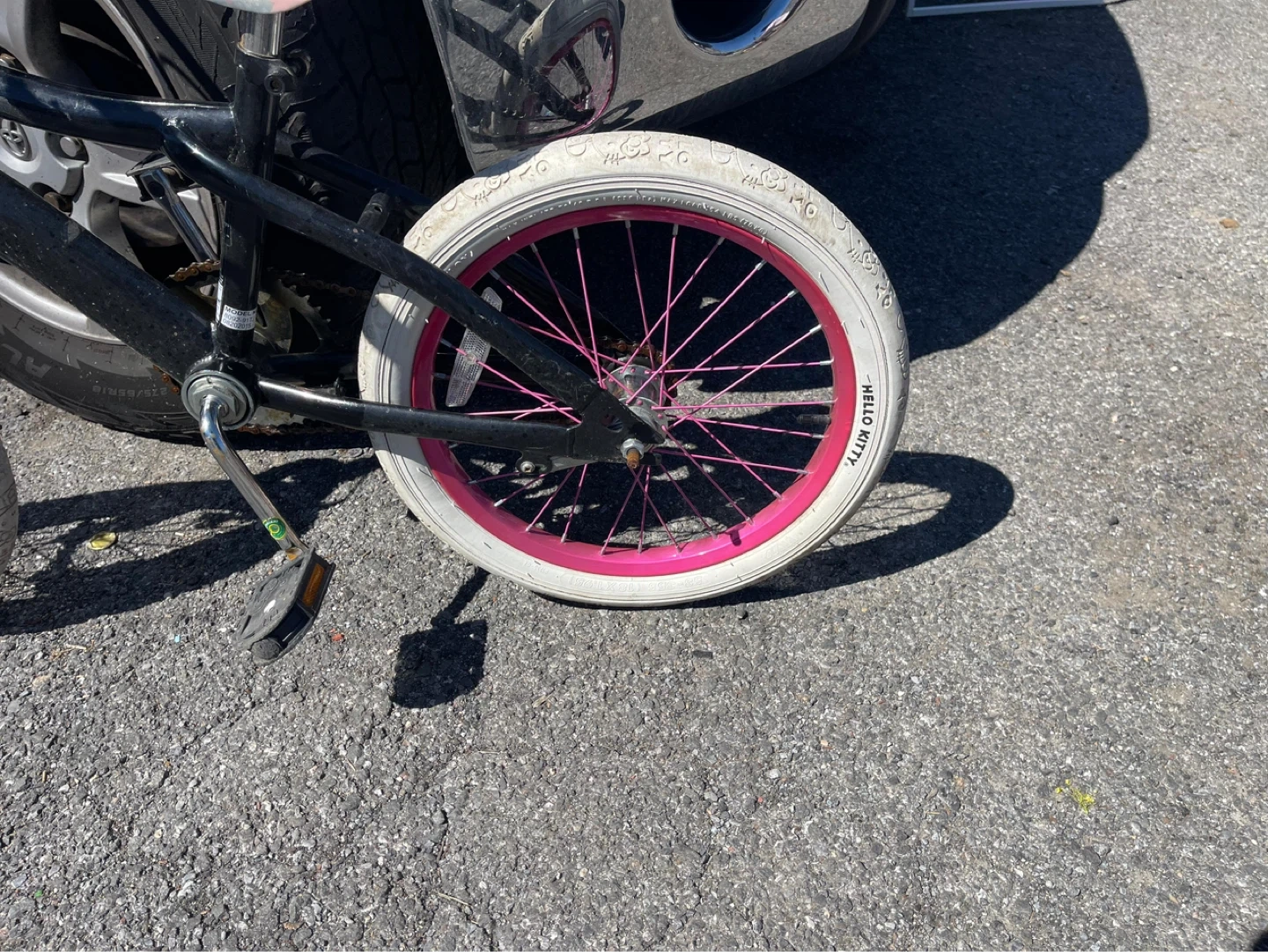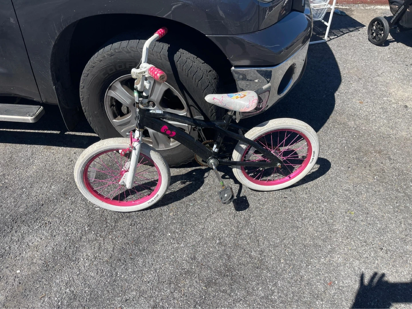 White and pink Hello Kitty kids BMX bike. Features white tires with pink rims and spokes. Ideal for young riders looking for a fun and stylish bike for recreational use. Bike includes pedals and handlebars. 20 inch