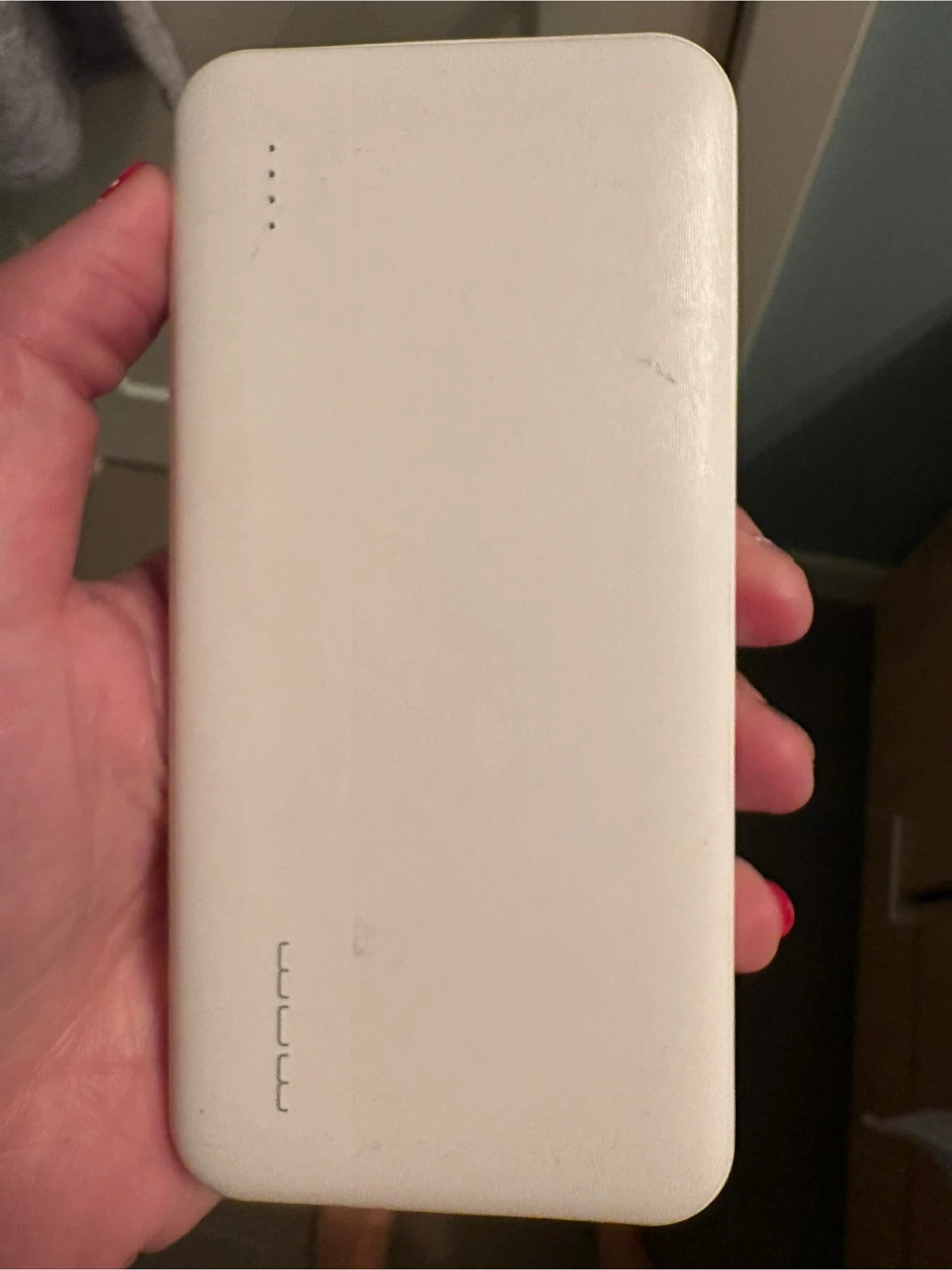 White power bank with a 10000mAh capacity. Input and output are both 5V-2.1A(Max). It's great for charging devices on the go! Very powerful. Can probably charge iPad a few times.