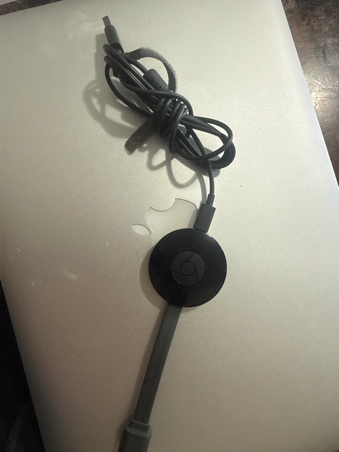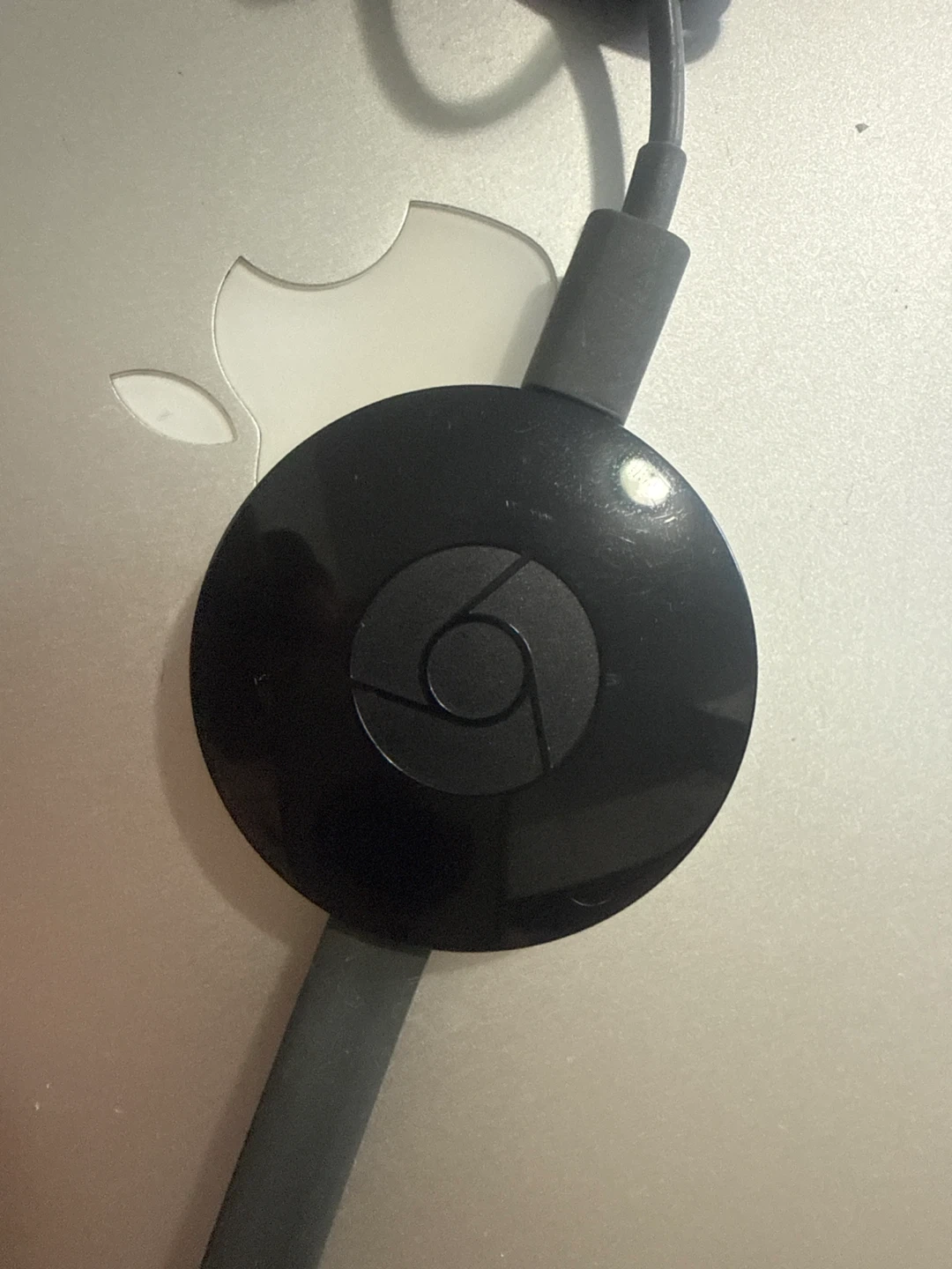 Black Google Chromecast streaming device. Plug it into your TV to stream content from your phone or computer. Connects via HDMI and powered by USB.
