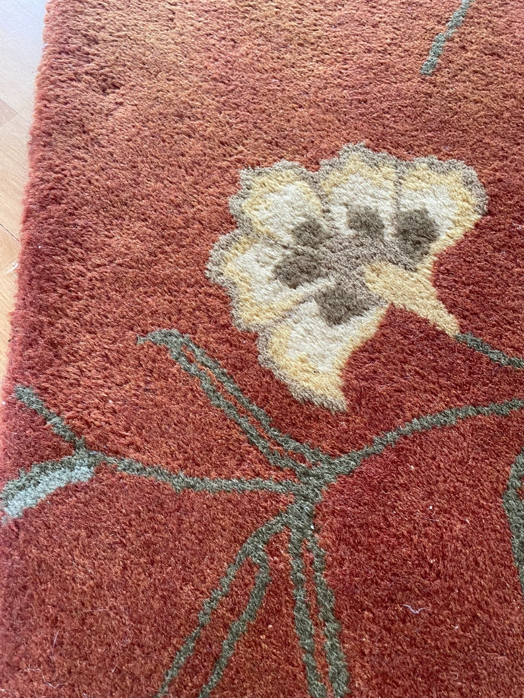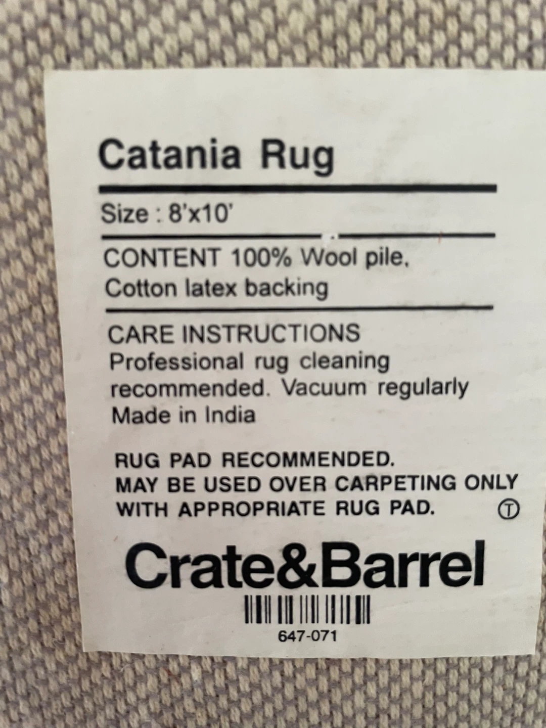 Selling a Crate & Barrel Catania Rug. It's sized at 8'x10' and made with 100% wool pile and cotton latex backing. It has a beautiful floral design in shades of orange, brown, and green. Made in India.