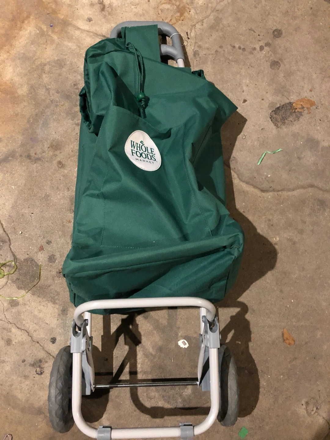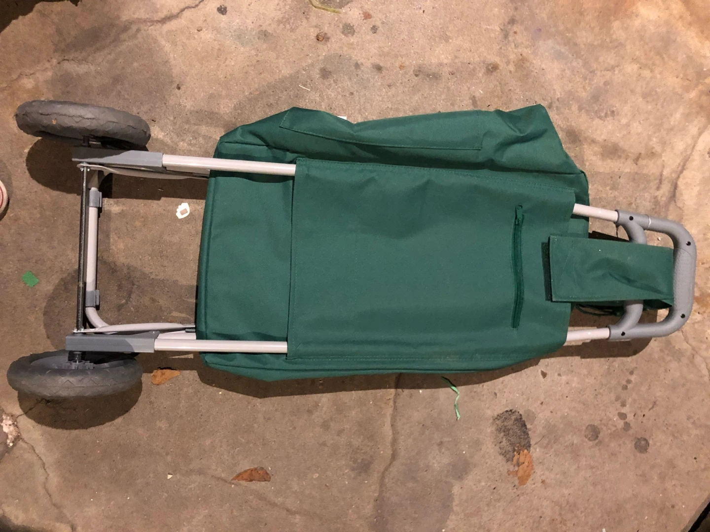 This green rolling shopping cart has a large capacity bag and sturdy wheels. It features a zippered pocket on the side for smaller items. Great for grocery runs or other errands!