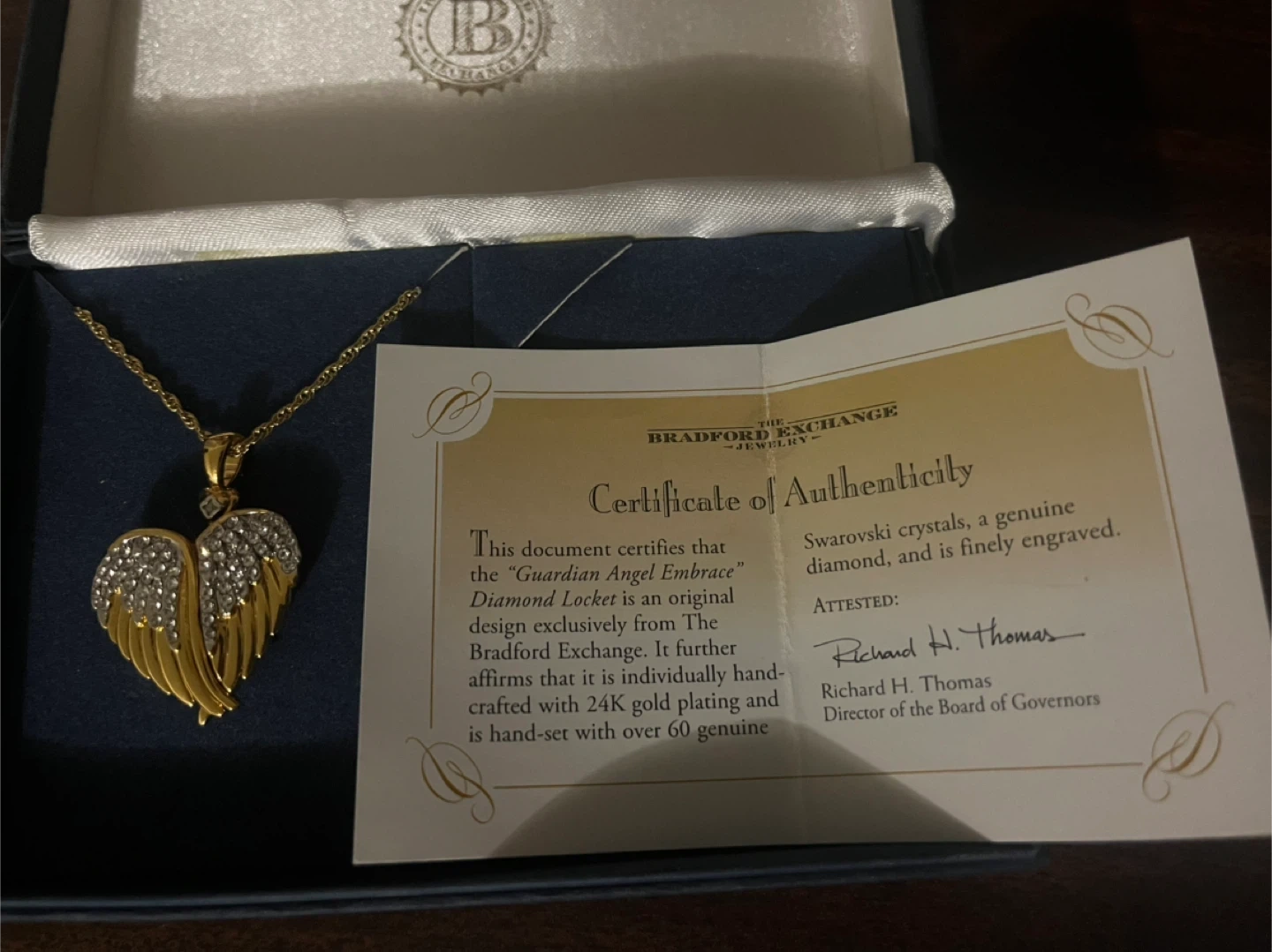 This beautiful locket is designed as a heart with angel wings and is adorned with Swarovski crystals and a genuine diamond. It's handcrafted with 24K gold plating and comes in its original box with a certificate of authenticity. The locket opens to reveal space for cherished photos.