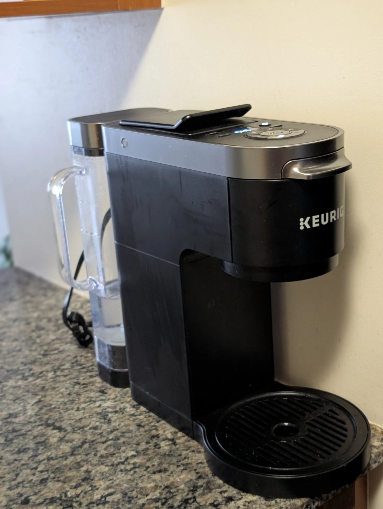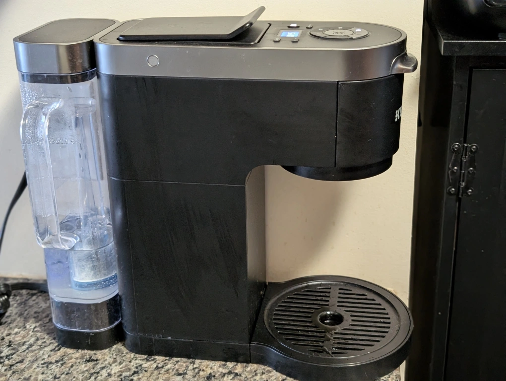 This coffee machine brews single cups or a full 12-cup carafe. The water tank can be placed behind or on either side. It is clean, well-maintained, and ready for its new home.
