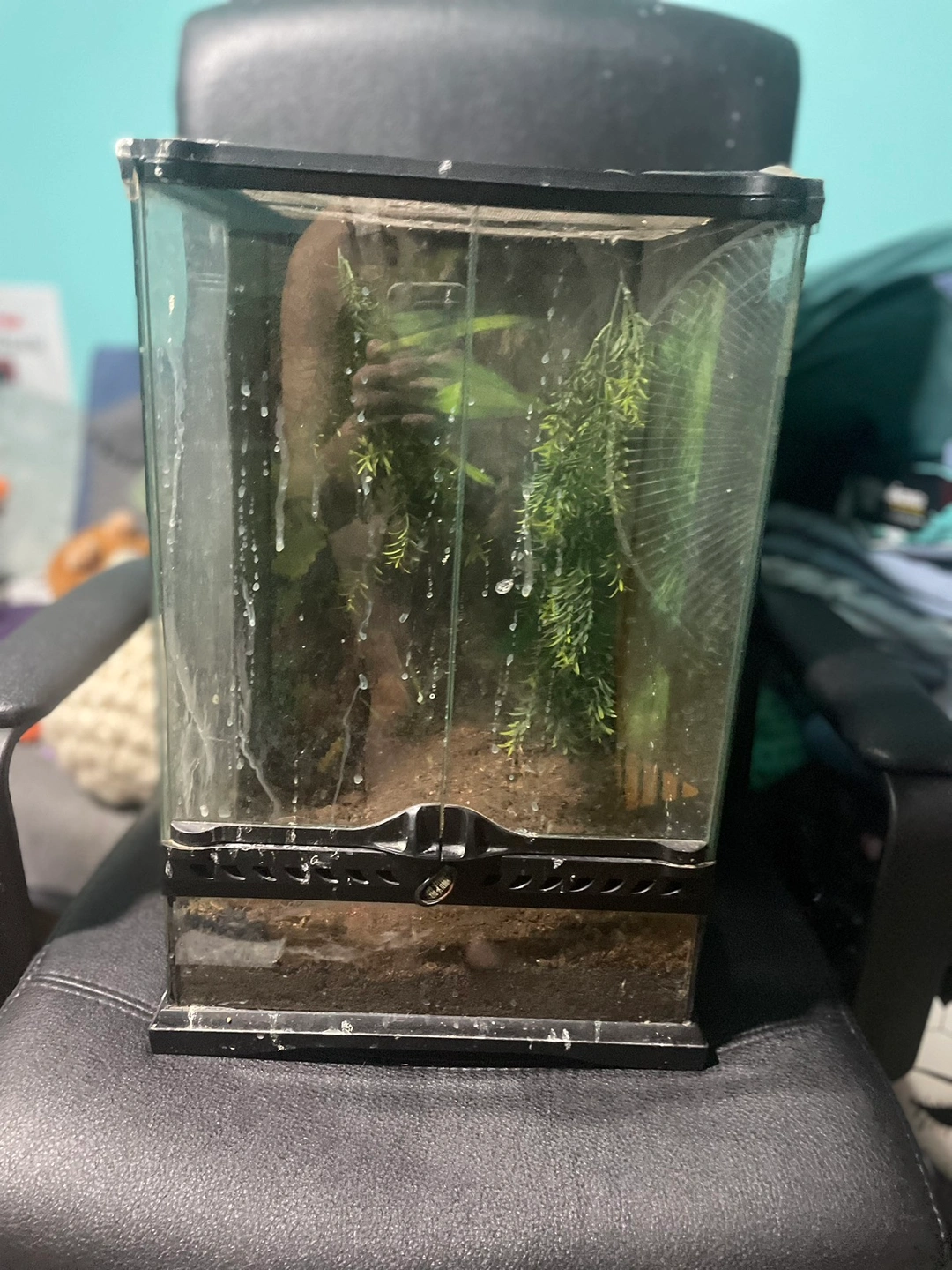 Small reptile tank with background and two plants. Definitely needs cleaning but that’s why it’s free. dimensions are 12x12x18! Great for small reptile or spider.