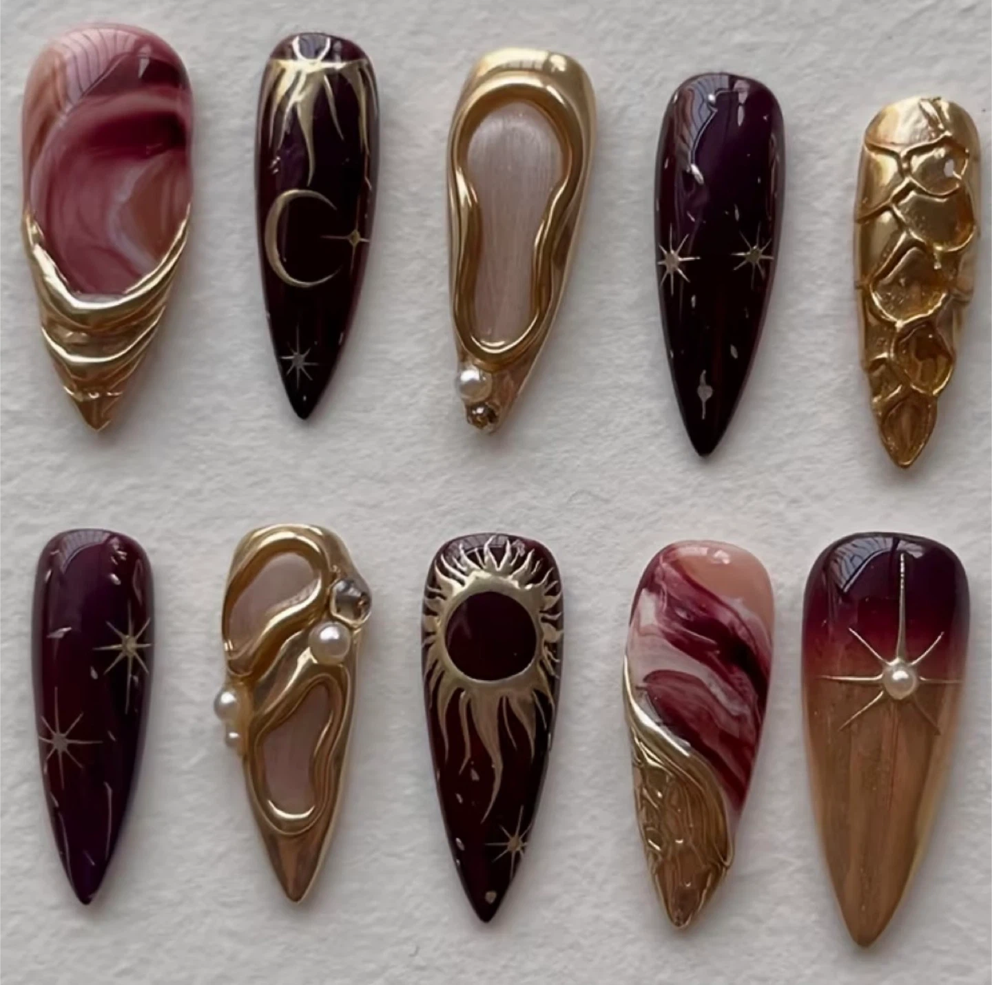 This set features 10 unique press-on nails with a variety of celestial and abstract designs. They're crafted with intricate gold accents and rich jewel-toned bases. These nails offer a bold, artistic look for any occasion! Great for special events or adding a unique flair to your style.